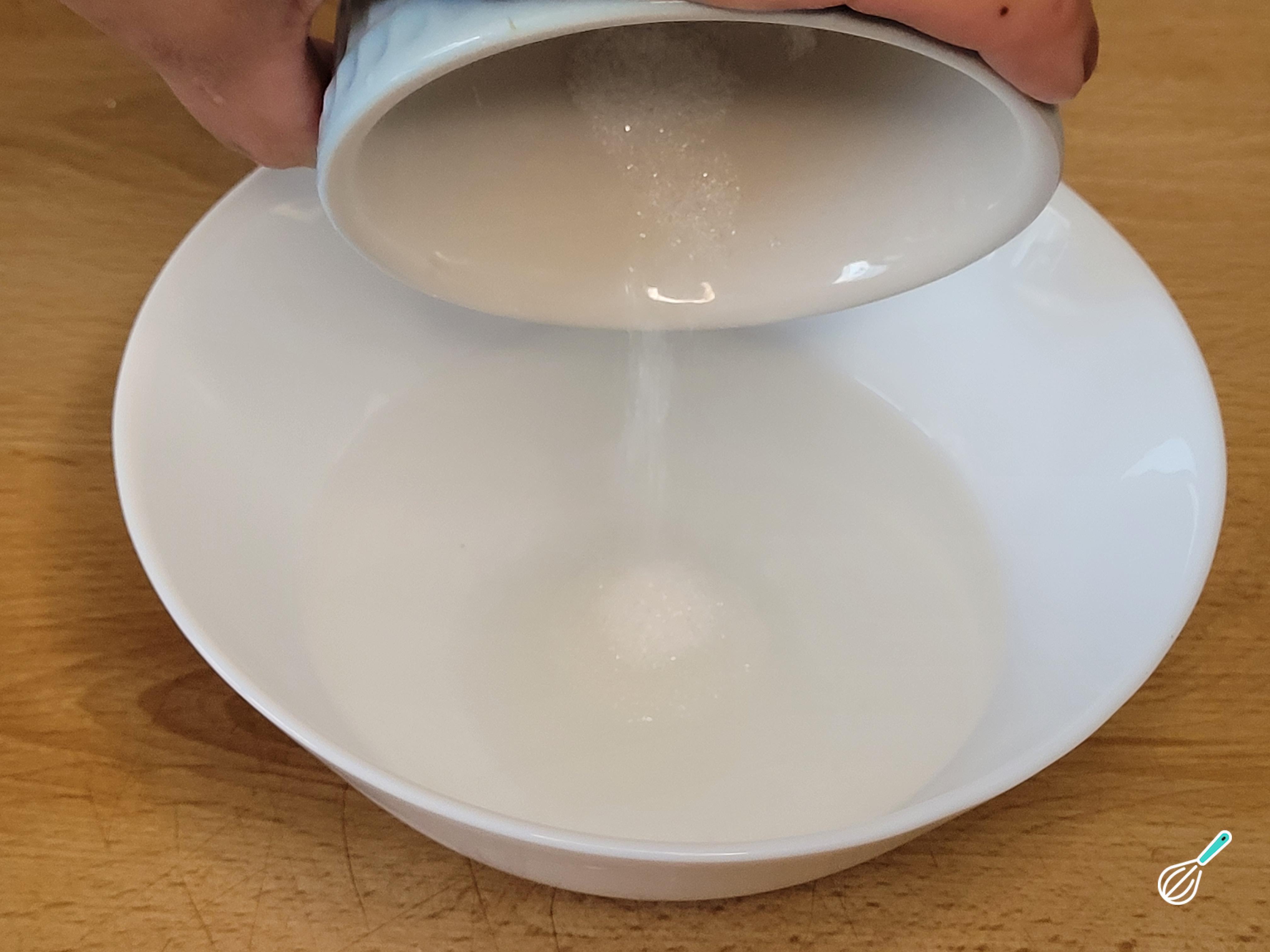 Enquanto isso, prepare a mistura de vinagre e açúcar que caracteriza essa salada misturando o vinagre de arroz com o açúcar. Mexa bem para dissolver todo o açúcar.