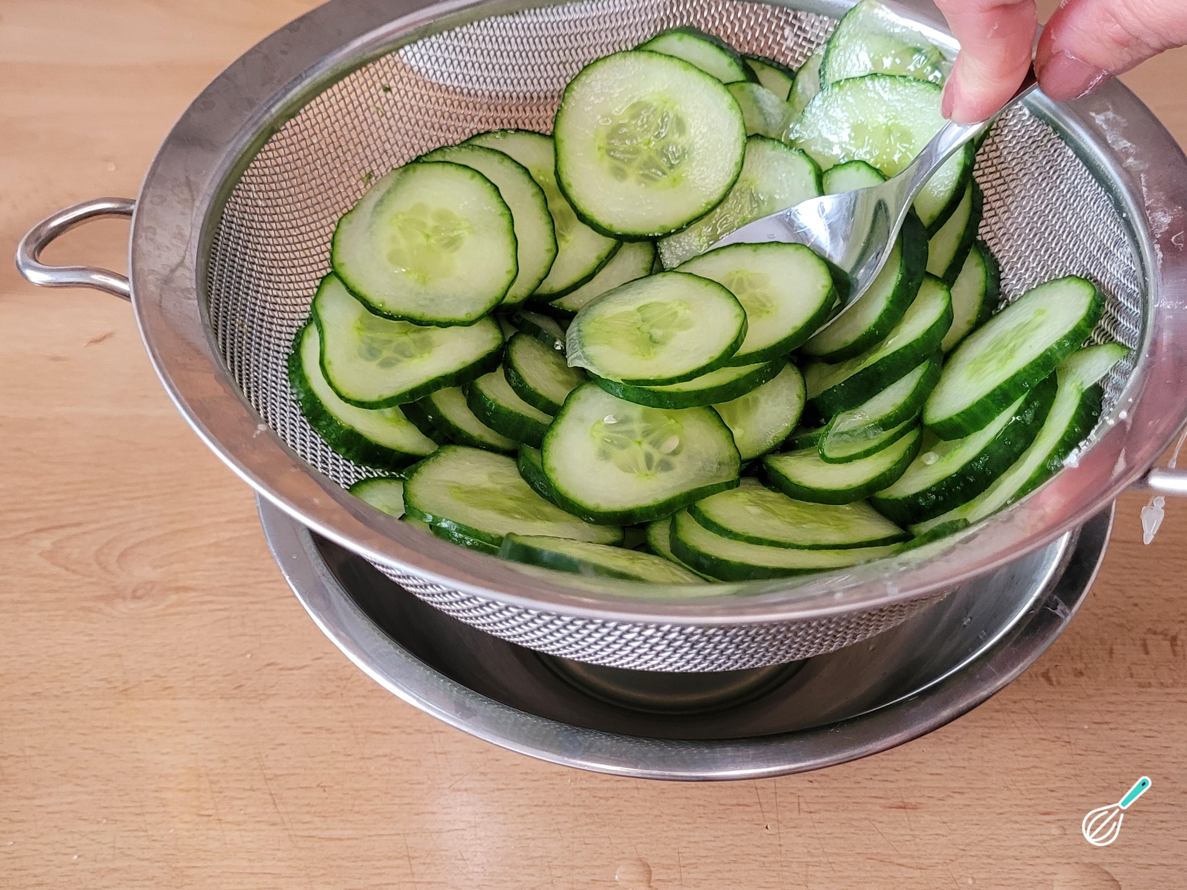 Depois de 15 minutos, aperte as fatias de pepino com uma colher para tirar o excesso de água
