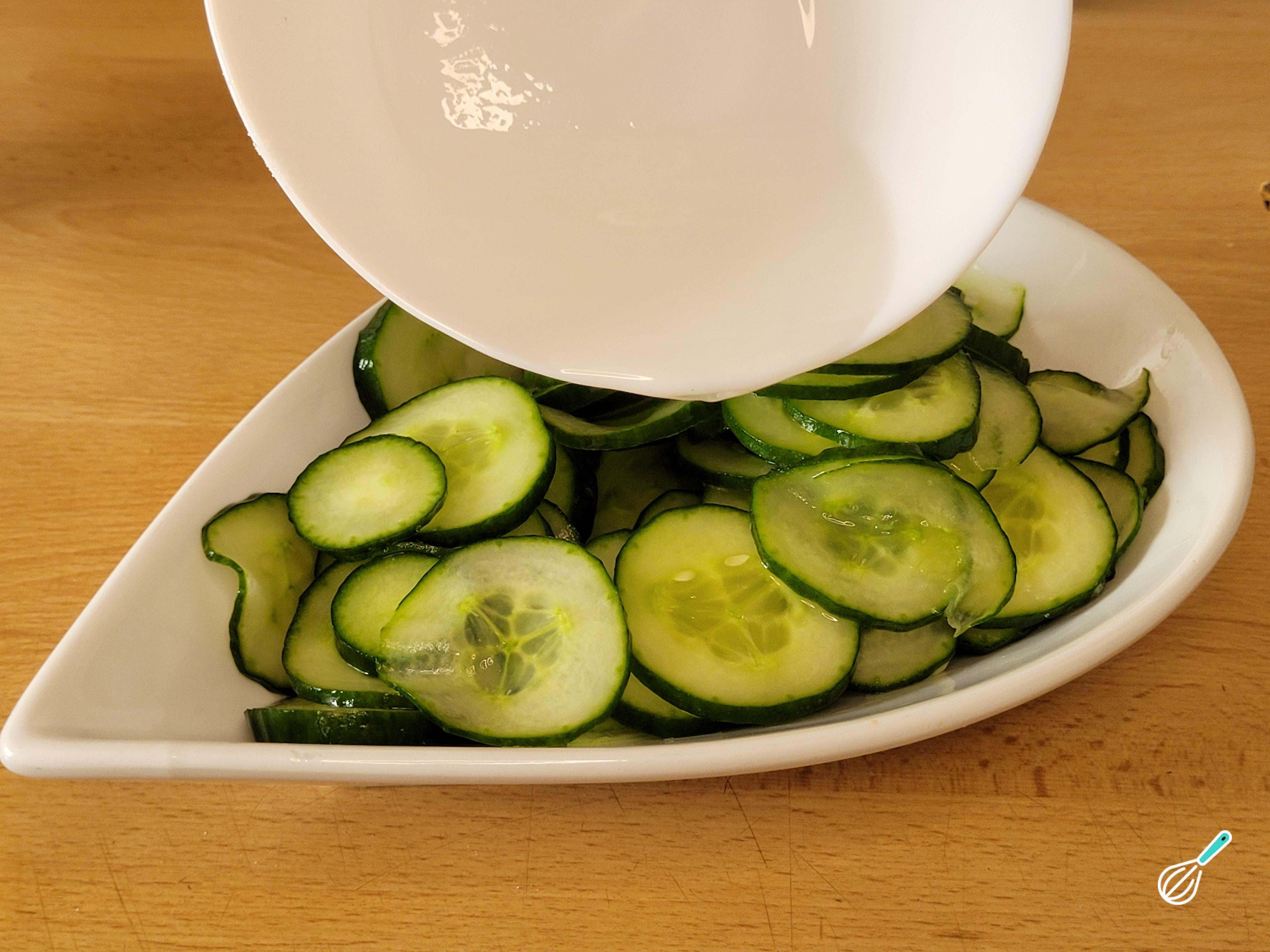 Regue as fatias de pepino com a mistura de vinagre e açúcar.