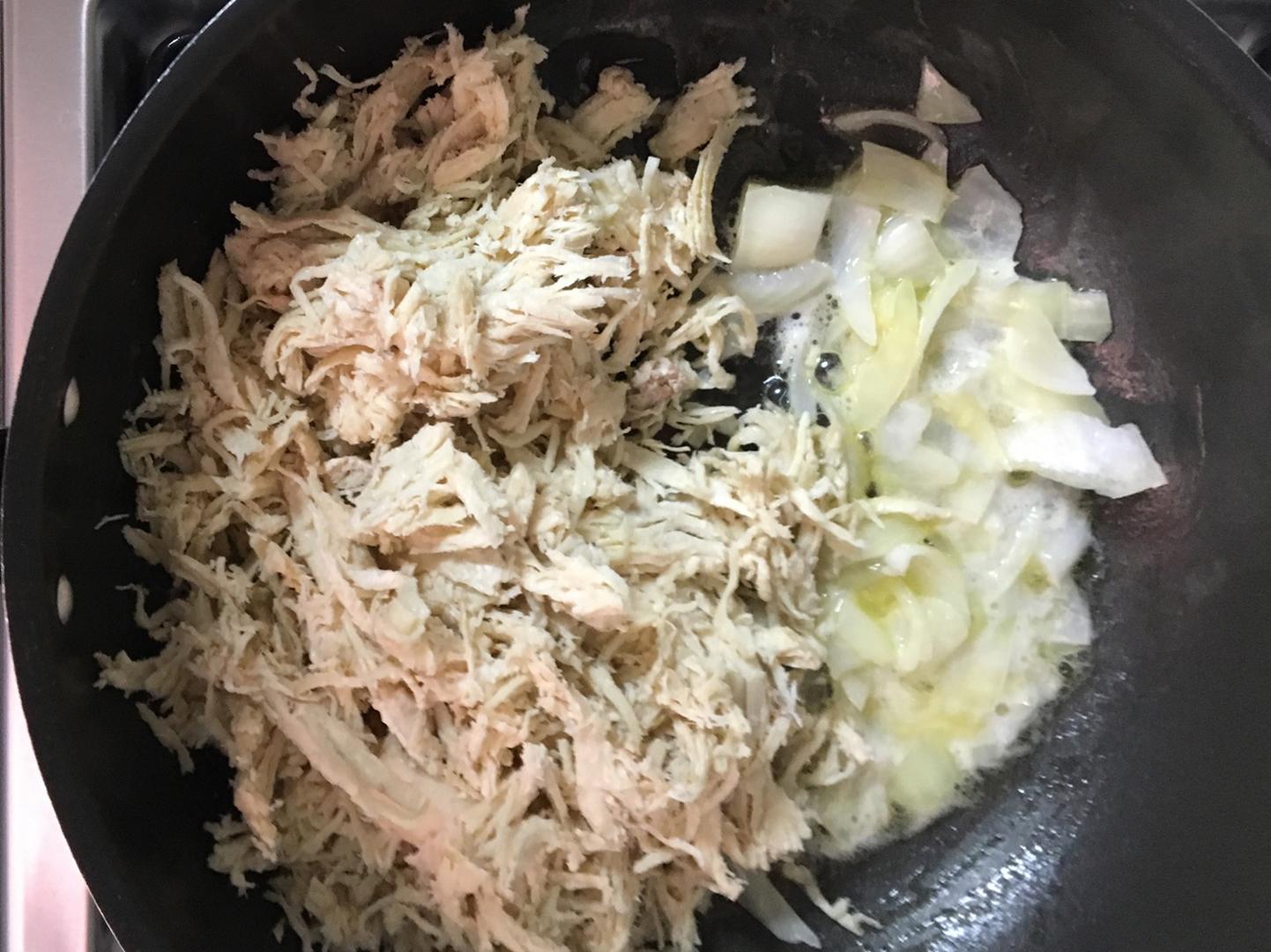 Em seguida leve ao fogo uma panela com o azeite, a cebola e os alhos e deixe até começar a dourar. Coloque o frango, misture e deixe por mais 1-2 minutos.