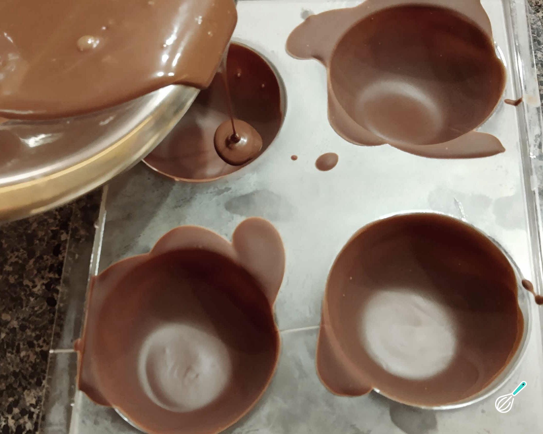 Divida o chocolate derretido numa forminha para chocolate e espalhe bem pelo fundo e laterais, de modo a conseguir uma camada homogênea. Escorra o excesso de chocolate e reserve na geladeira por 5-10 minutos, para firmar.