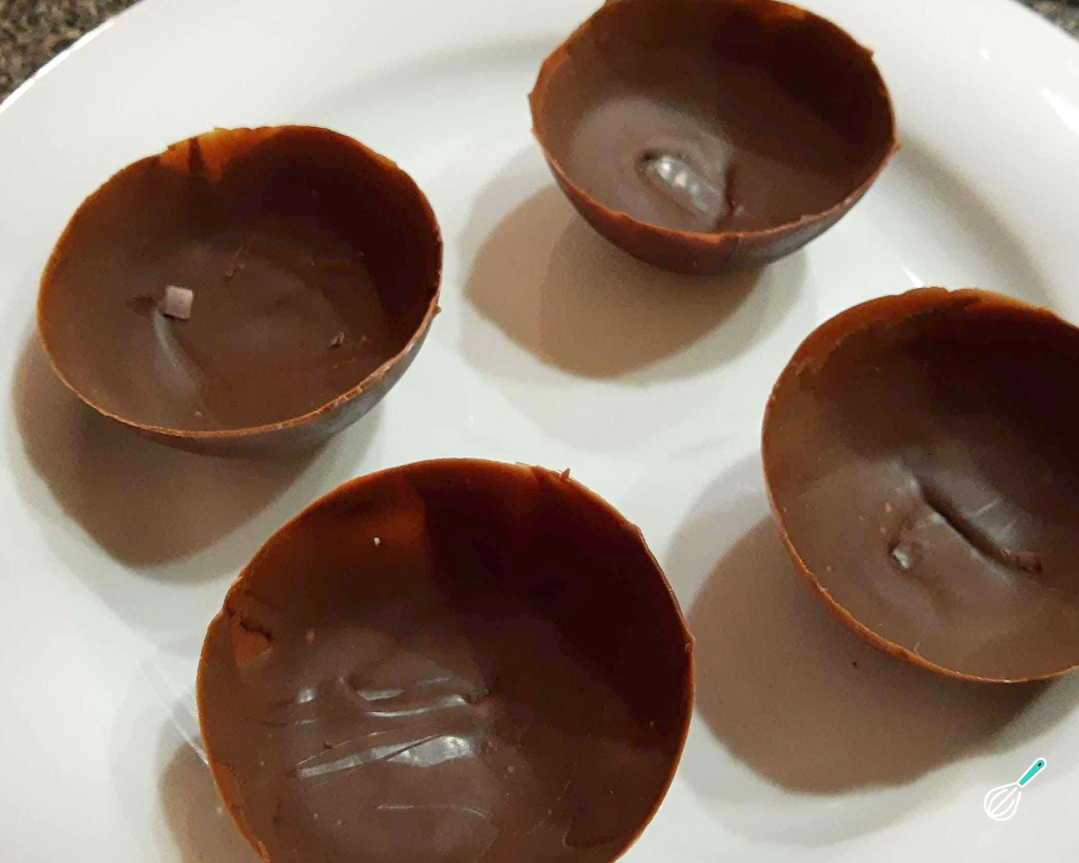 Quando a casquinha de chocolate estiver durinha e desgrudar da forma, pode desenformar. Faça isso cuidadosamente para não quebrar o chocolate.
