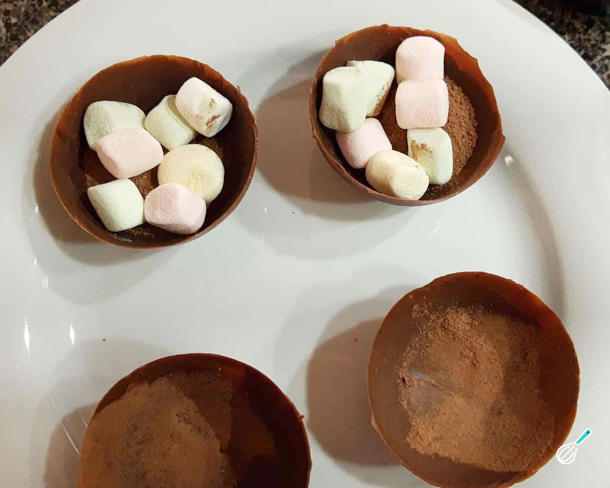 Polvilhe um pouco de chocolate em pó em metade das casquinhas de chocolate e recheie com mini marshmallows.