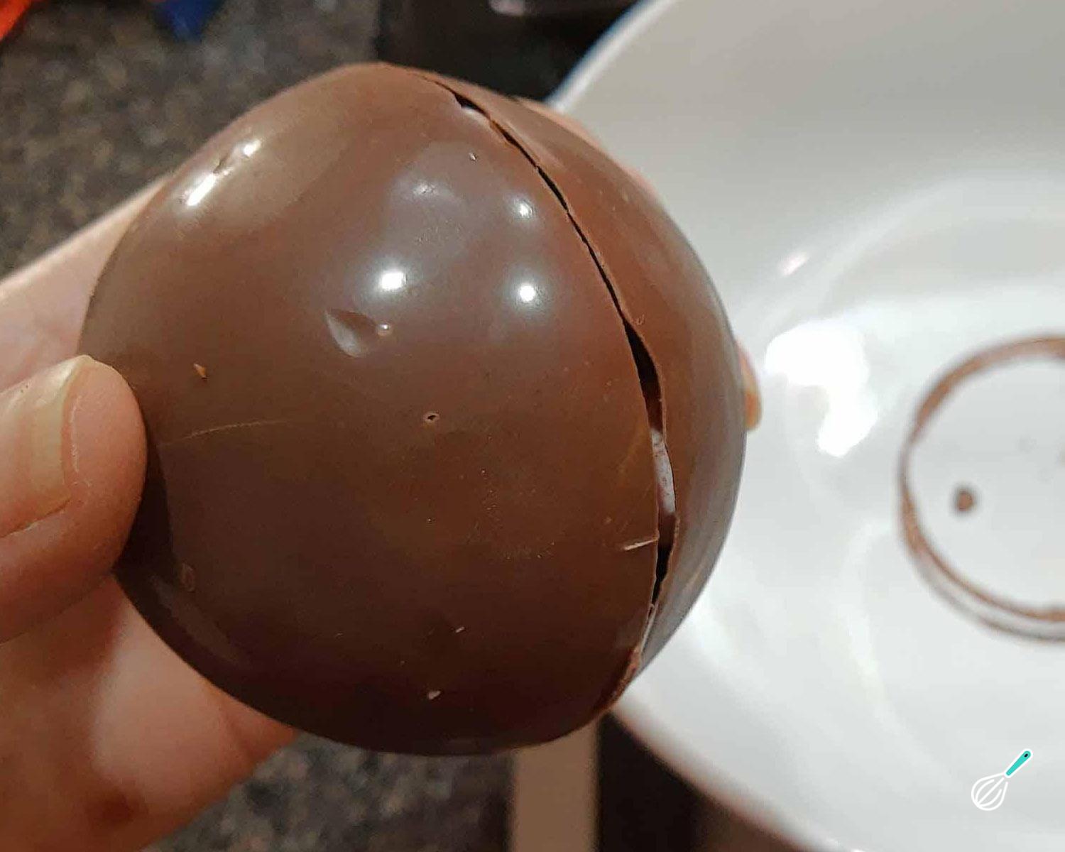 Para unir as metades das casquinhas simplesmente esquente um prato no microondas até ficar bem quente. Encoste no prato as casquinhas de chocolate sem marshmallow, com as beiradas viradas para baixo, para derreter ligeiramente o chocolate. Enquanto o chocolate está derretido junte essa casquinha de chocolate com uma das casquinhas de chocolate recheadas e pressione levemente, para grudar.
