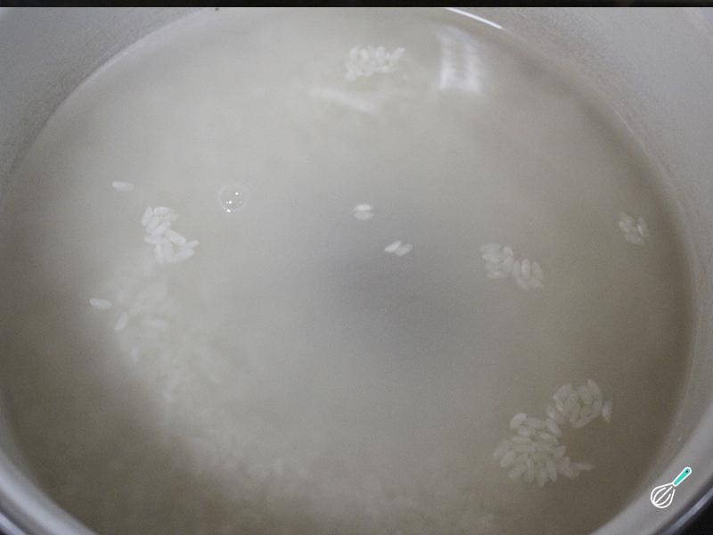 Comece por cozinhar o arroz. Coloque o arroz em uma taça e lave bem com água fria, para que atinga bem o ponto de cozedura. Passei o arroz cinco vezes por água.
