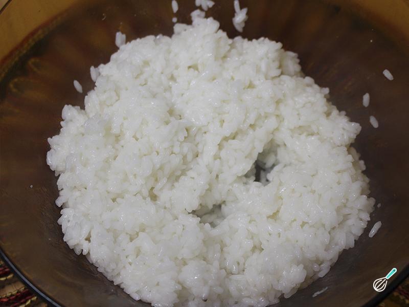 Coloque o arroz em uma taça e com a ajuda de uma ventoinha, ajude o arroz a esfriar. Quando o arroz estiver esfriado, junte o molho que preparou anteriormente.