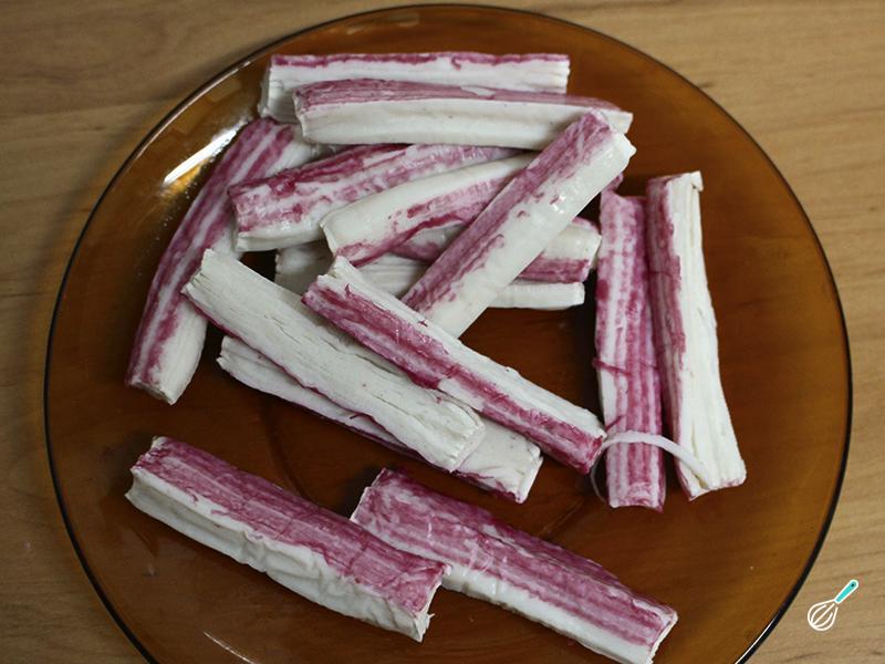 Pique o kani de caranguejo para rechear o seu sushi especial.