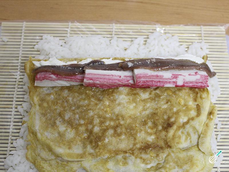 Uma vez, o arroz estendido, coloque o crepe, de seguida espalhe o queijo creme sobre o crepe e de seguida o kani de caranguejo. Depois de todos os ingredientes estarem estendidos, comece a enrolar, conforme a imagem abaixo.