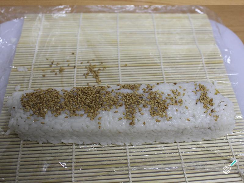 Vá enrolando com a ajuda da esteira e dos dedos. Uma vez, enrolado, retire o filme transparente e polvilhe com sementes de gergelim.