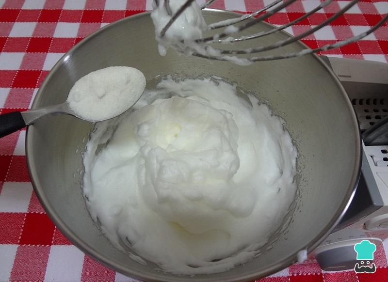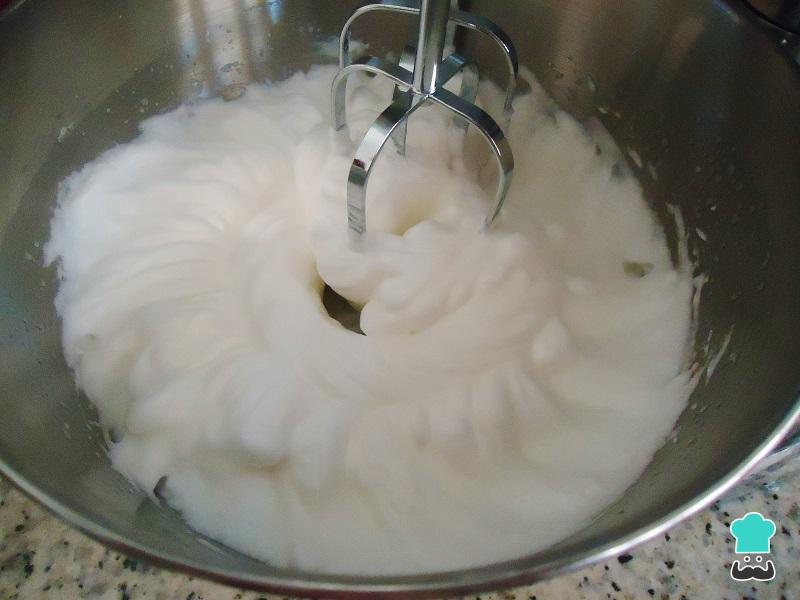 Quando as claras estiverem no ponto, não pare de bater e adicione o açúcar às colheres, finalizando com o suco de limão. Mexa até obter um creme e reserve.