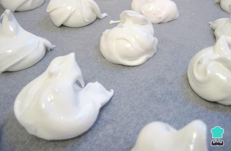 Forre uma assadeira com papel manteiga e disponha, afastadas, pequenas porções de suspiro com a ajuda de uma colher de sopa ou com o saco de confeiteiro.