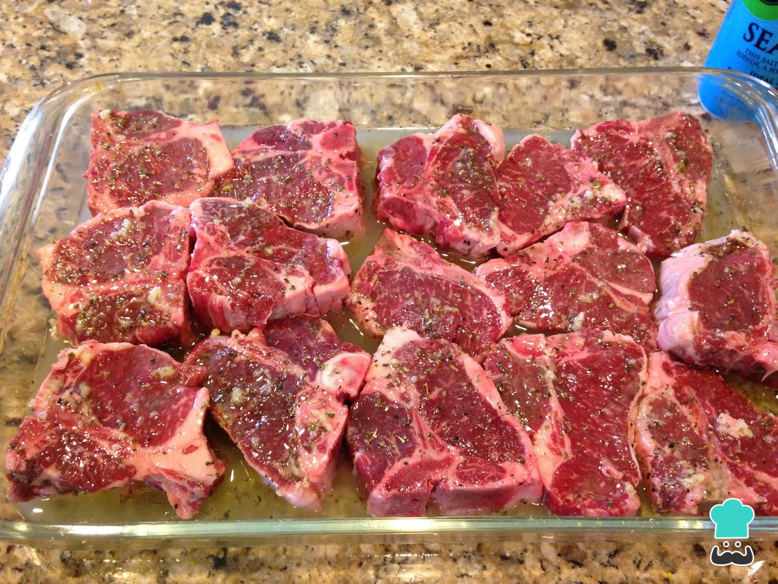 Para preparar esta saborosa receita de t-bone de cordeiro grelhado comece por marinar a carne: coloque os t-bone em um recipiente e cuba com o vinho branco.