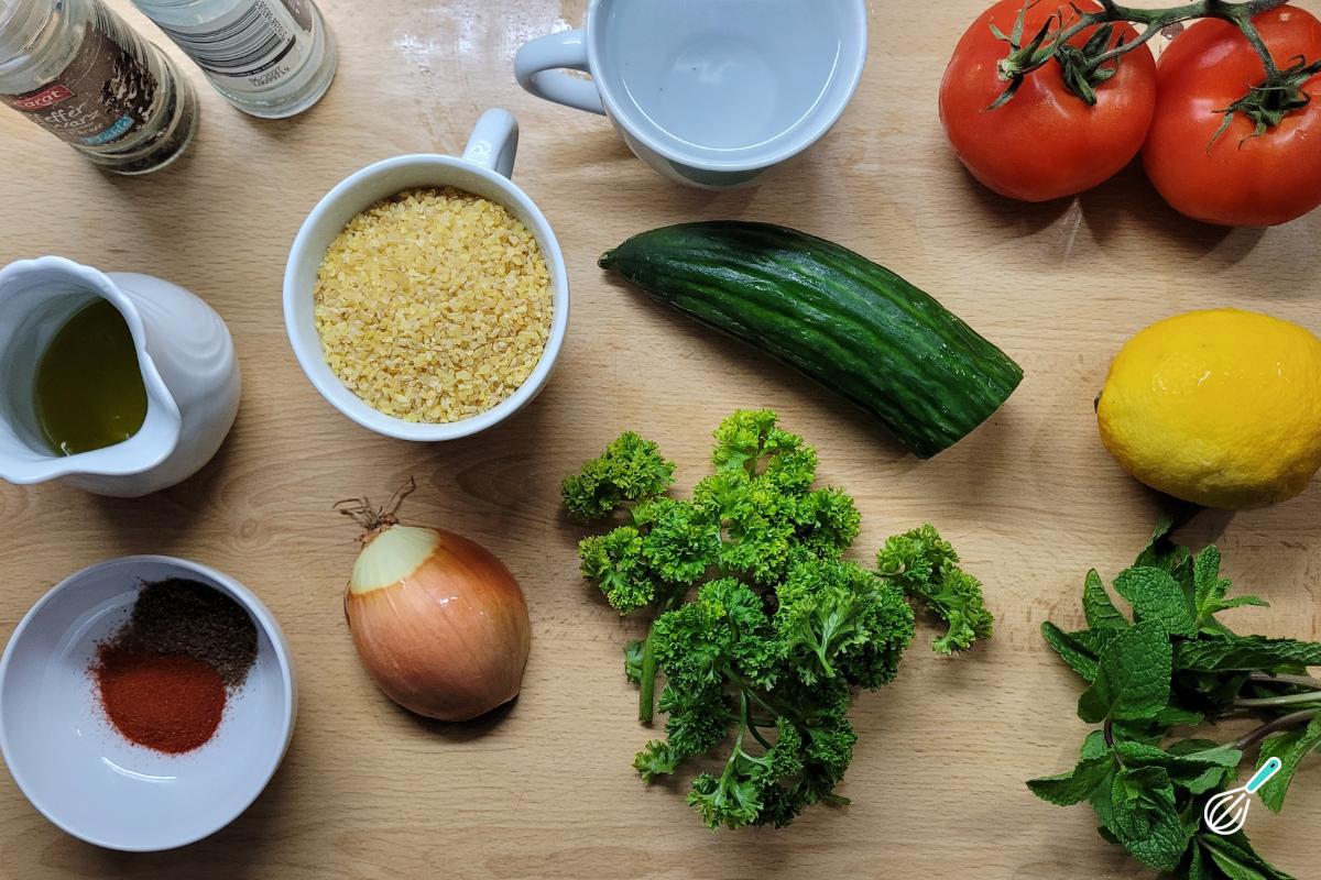 Separe os ingredientes para fazer o tabule tradicional. O trigo para quibe (também encontrado como triguilho ou bulgur) é um subproduto da produção do trigo e já passou por um pré-processamento, o que faz com que não precise ser cozido, apenas hidratado. Existem diversas variedades, dependendo do processamento. Aqui usei a clara, mas existem algumas mais escuras. Qualquer uma pode ser usada no tabule.