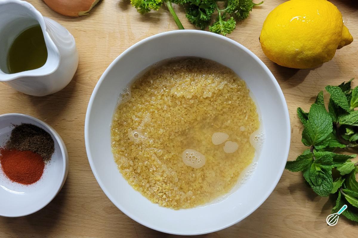 O primeiro passo é hidratar o trigo para quibe. Normalmente, se usam porções iguais do trigo para quibe e de um líquido quente (que pode ser água ou algum caldo). Aqui usei 1 xícara de trigo para quibe e 1 xícara de água quente para hidratar. Basta cobrir o triguiho com o líquido quente em uma tigela, cobrir com um prato e deixar por cerca de 10 minutos até ver que o triguilho absorveu a água.