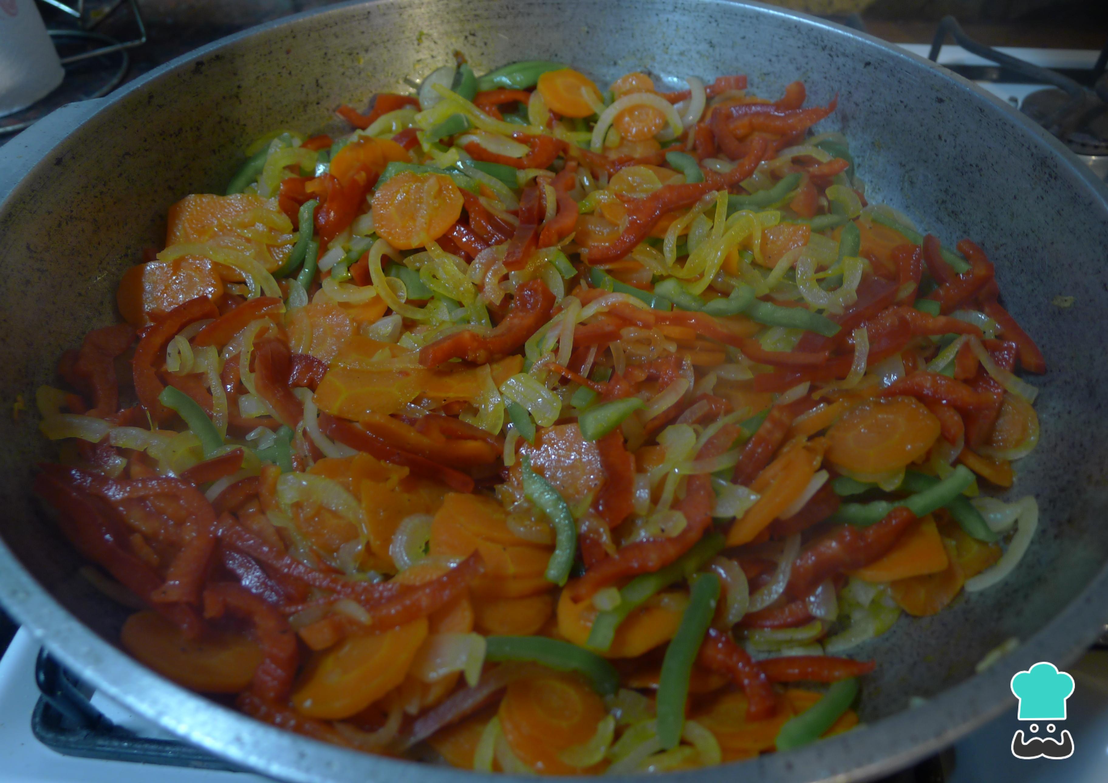 Lave os pimentões, retire a parte de dentro e corte em julienne (tiras finas). Descasque as cebolas e corte-as julienne também, descasque as cenouras e corte-as em rodelas finas.
