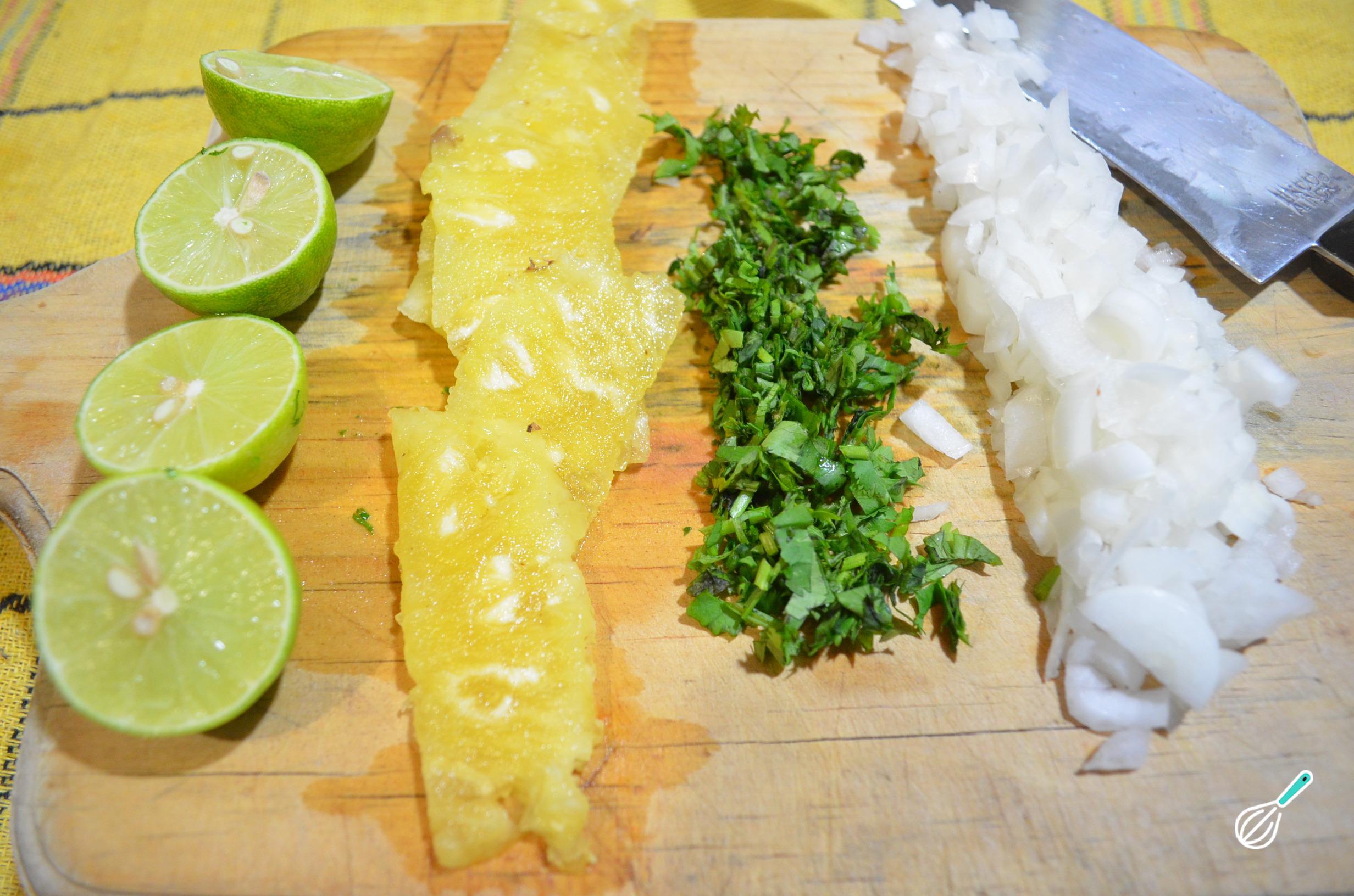 Comece por remover as veias e sementes da pimenta poblano. Lave os dentes de alho descascados, a cebola, os limões e o coentro. Corte os limões em metades, usando um para espremer o seu suco e colocando os outros em uma taça com a cebola e o coentro picados. Corte o abacaxi em fatias e reserve.