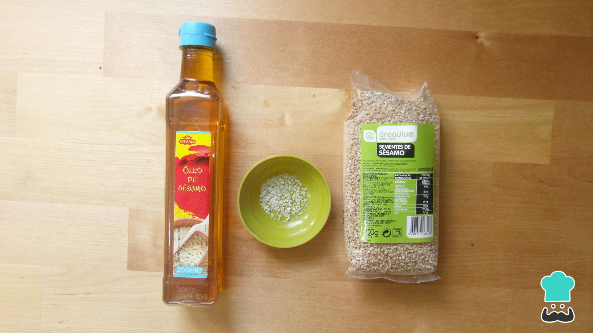 Para preparar o tahine caseiro comece por reunir os ingredientes. Você pode usar gergelim cru ou torrado, a diferença é que o gergelim torrado deixa um gosto um pouco amargo no tahine.