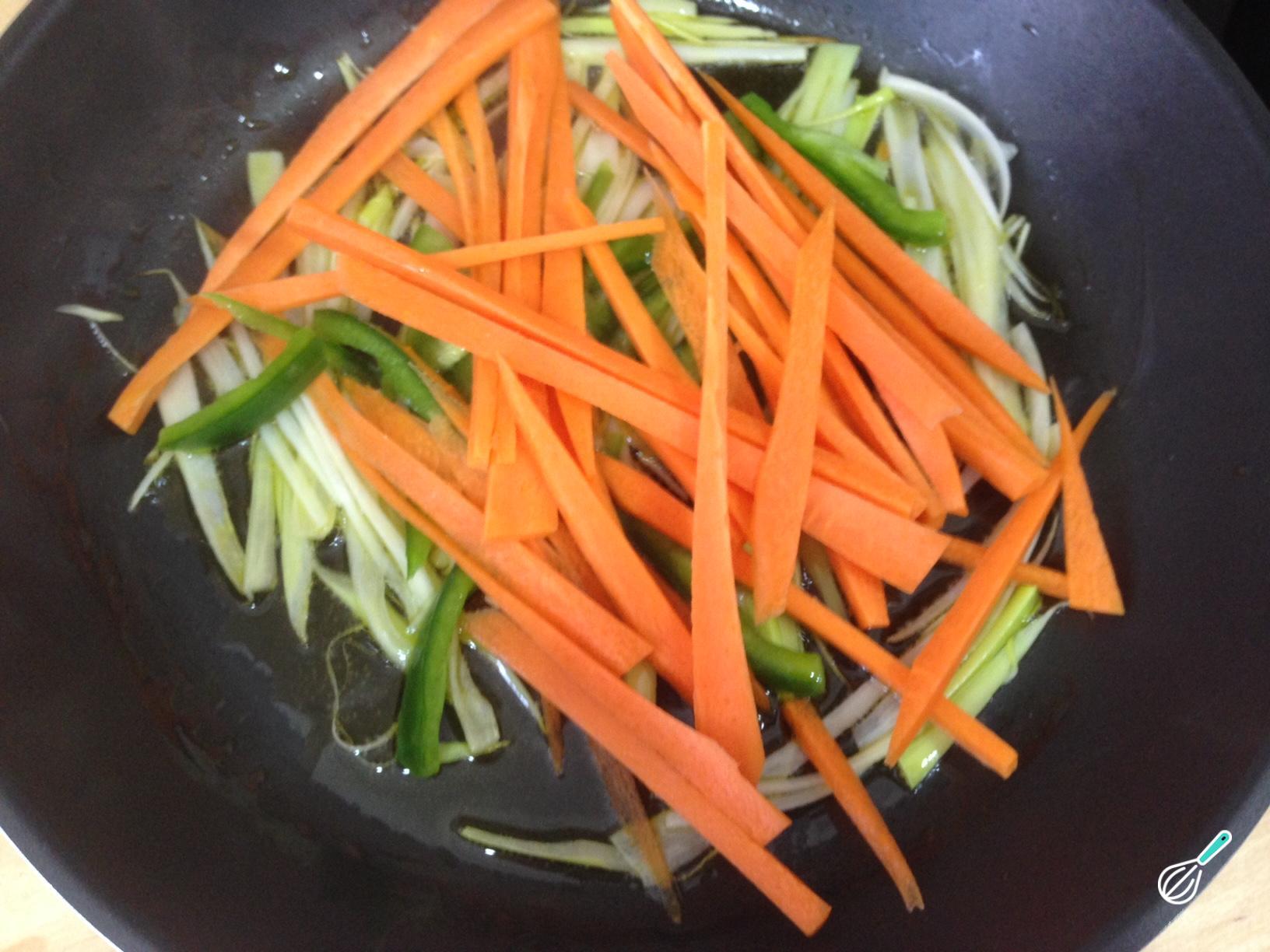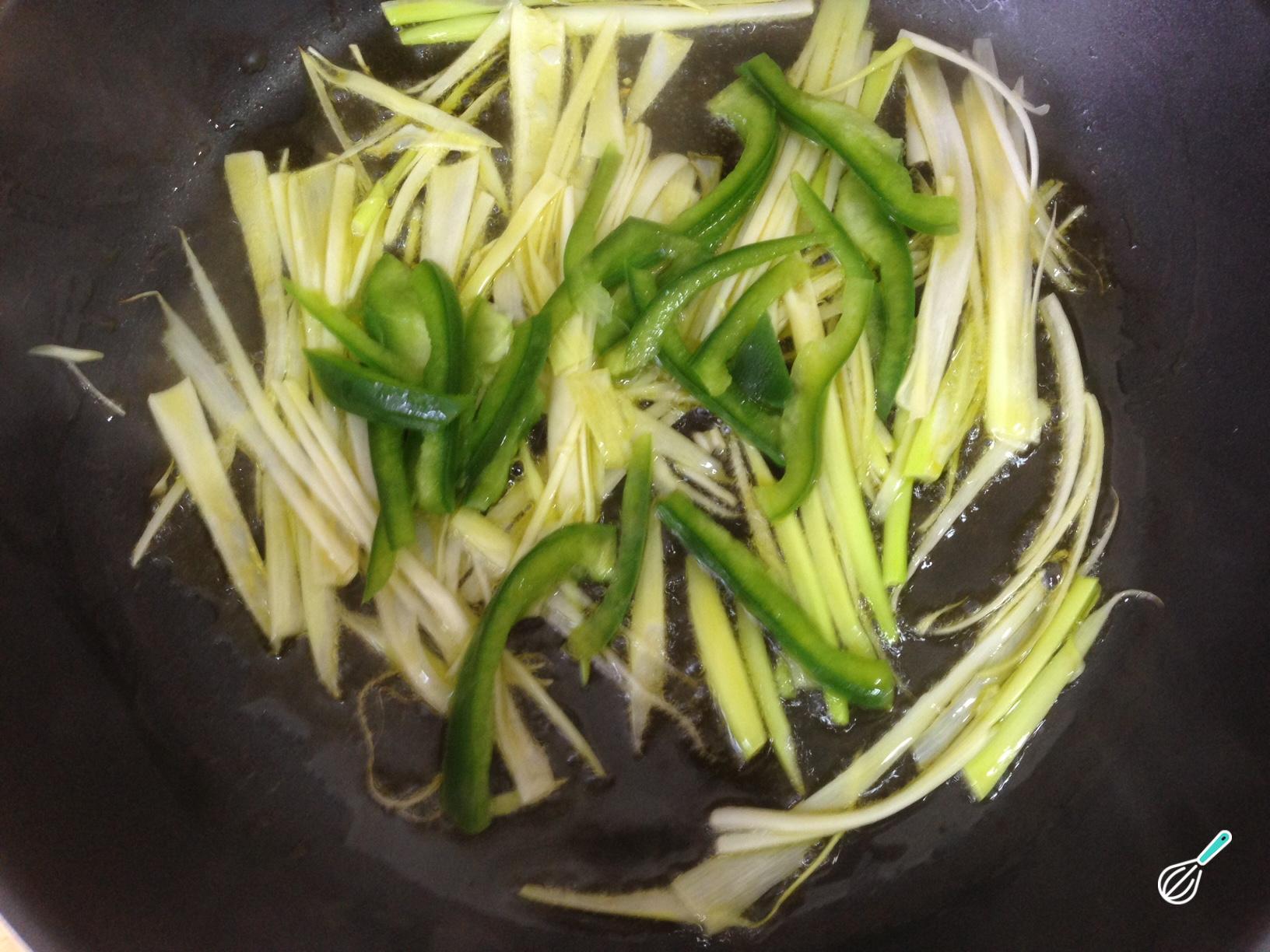 Em um wok ou frigideira com um pouco de óleo, refogue o alho-poró e o pimentão por 3 minutos, temperados com sal a gosto.