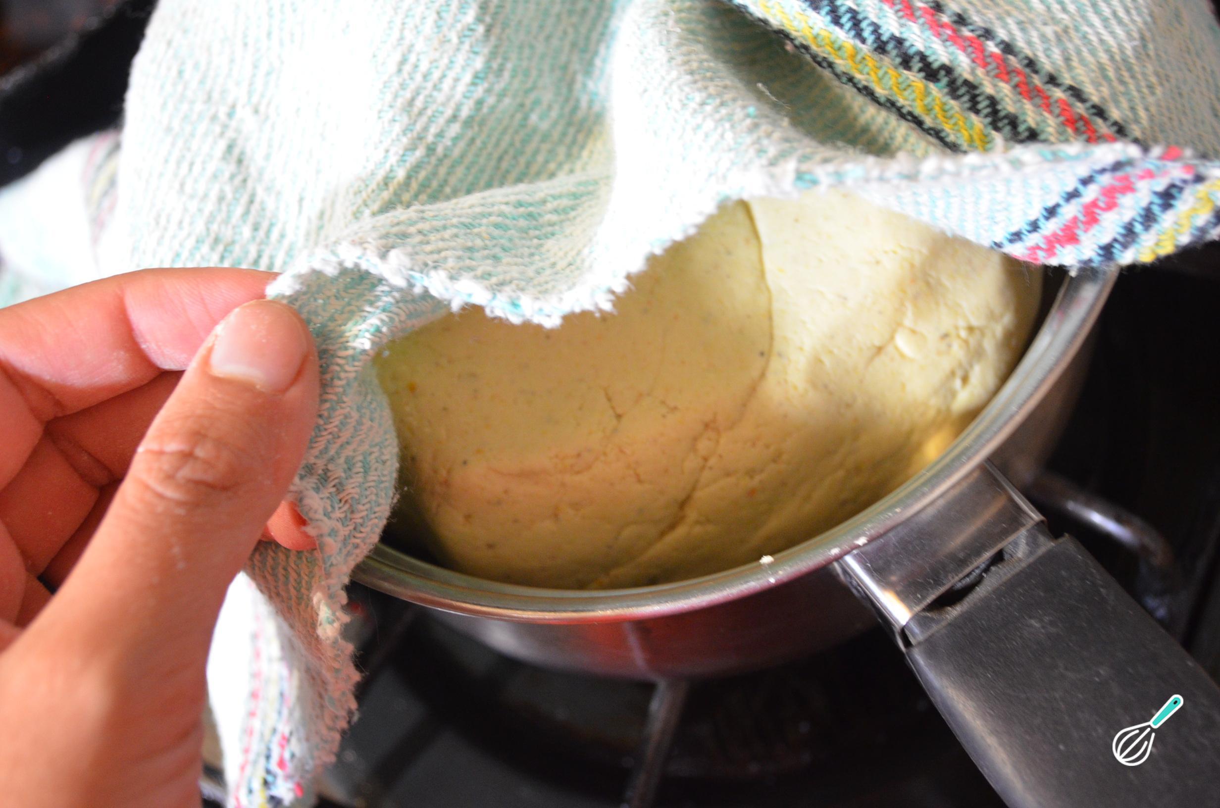 Para fazer os tamales mexicanos, começamos por colocar a massa de tortilha dentro de uma panela coberta com um pano limpo e úmido. Deixe a massa ao lado do fogão todo dia para ganhar um sabor mais azedo.
