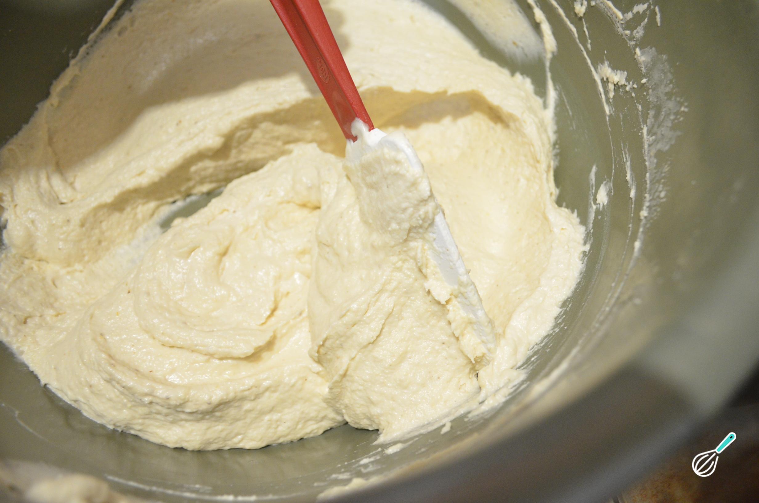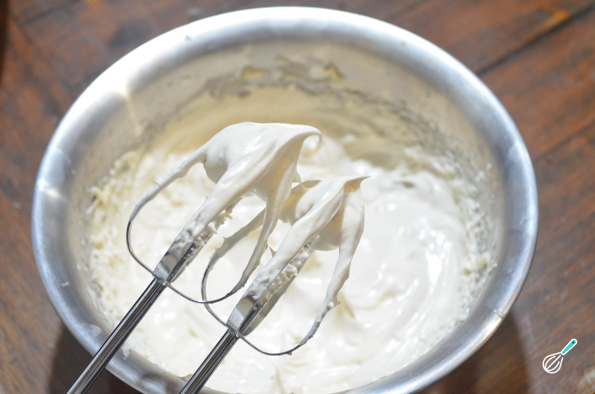 Em uma tigela separada, bata a banha de porco junto com duas pedras de gelo para evitar que esquente. Bata em velocidade média até formar picos suaves.