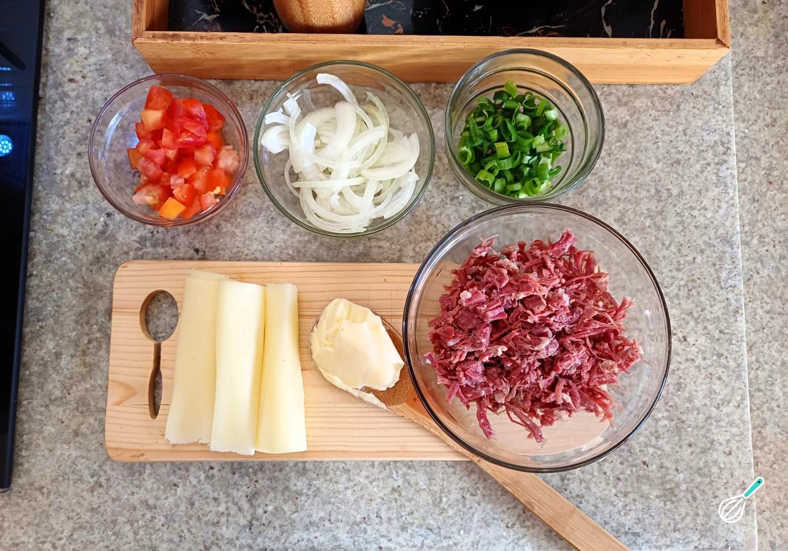 Separe os ingredientes necessários para o preparo da tapioca com carne seca.