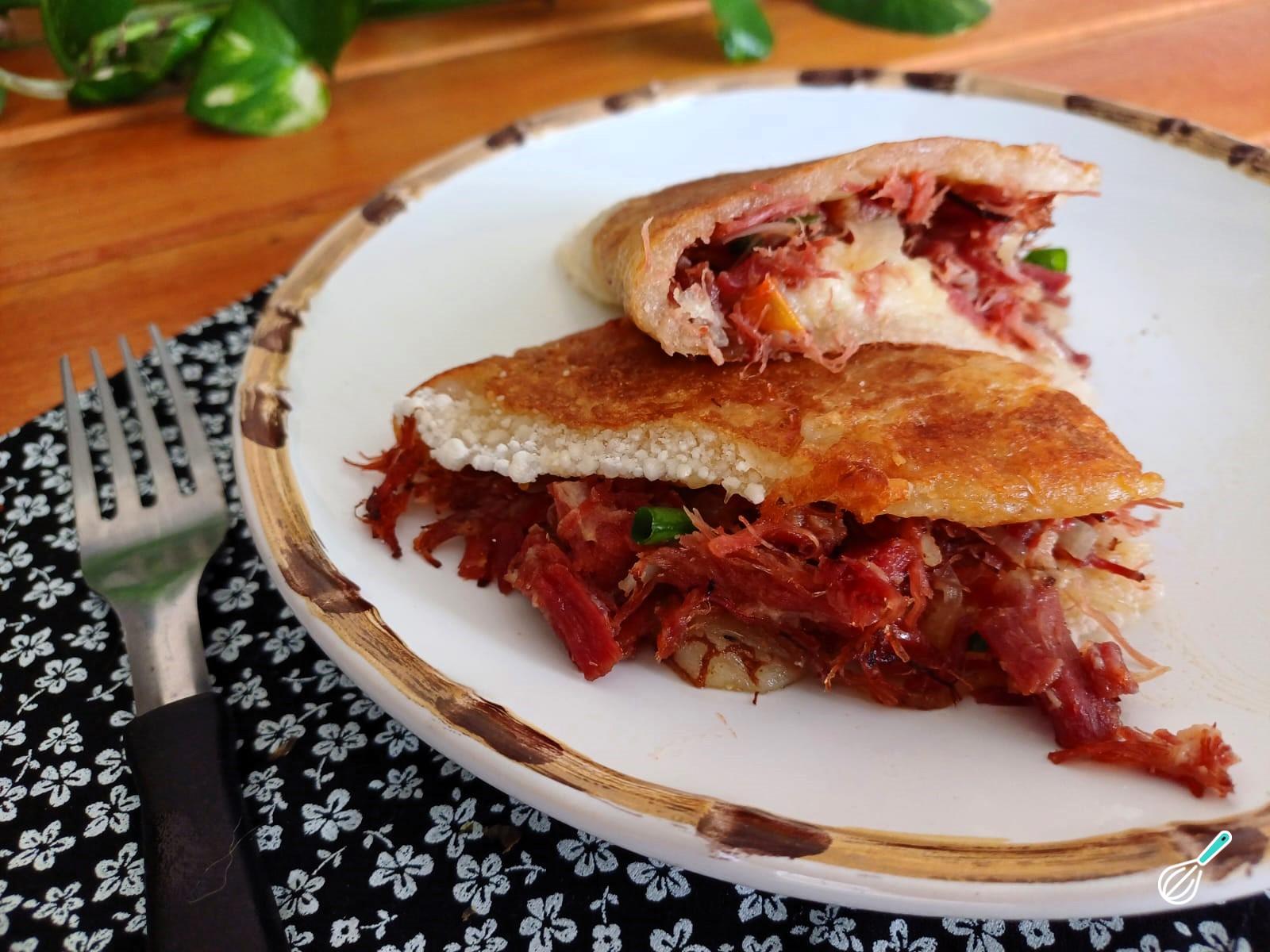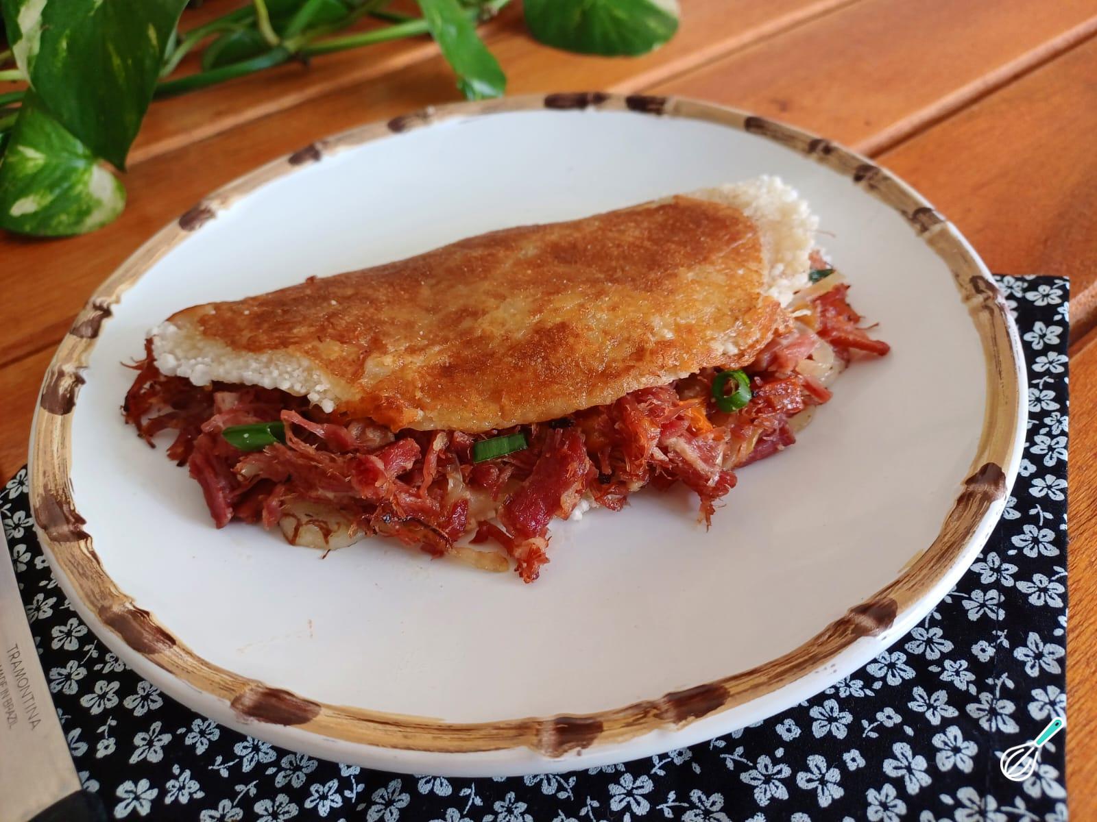 Prontinho! Sua tapioca de carne seca está pronta para ser servida e saboreada.