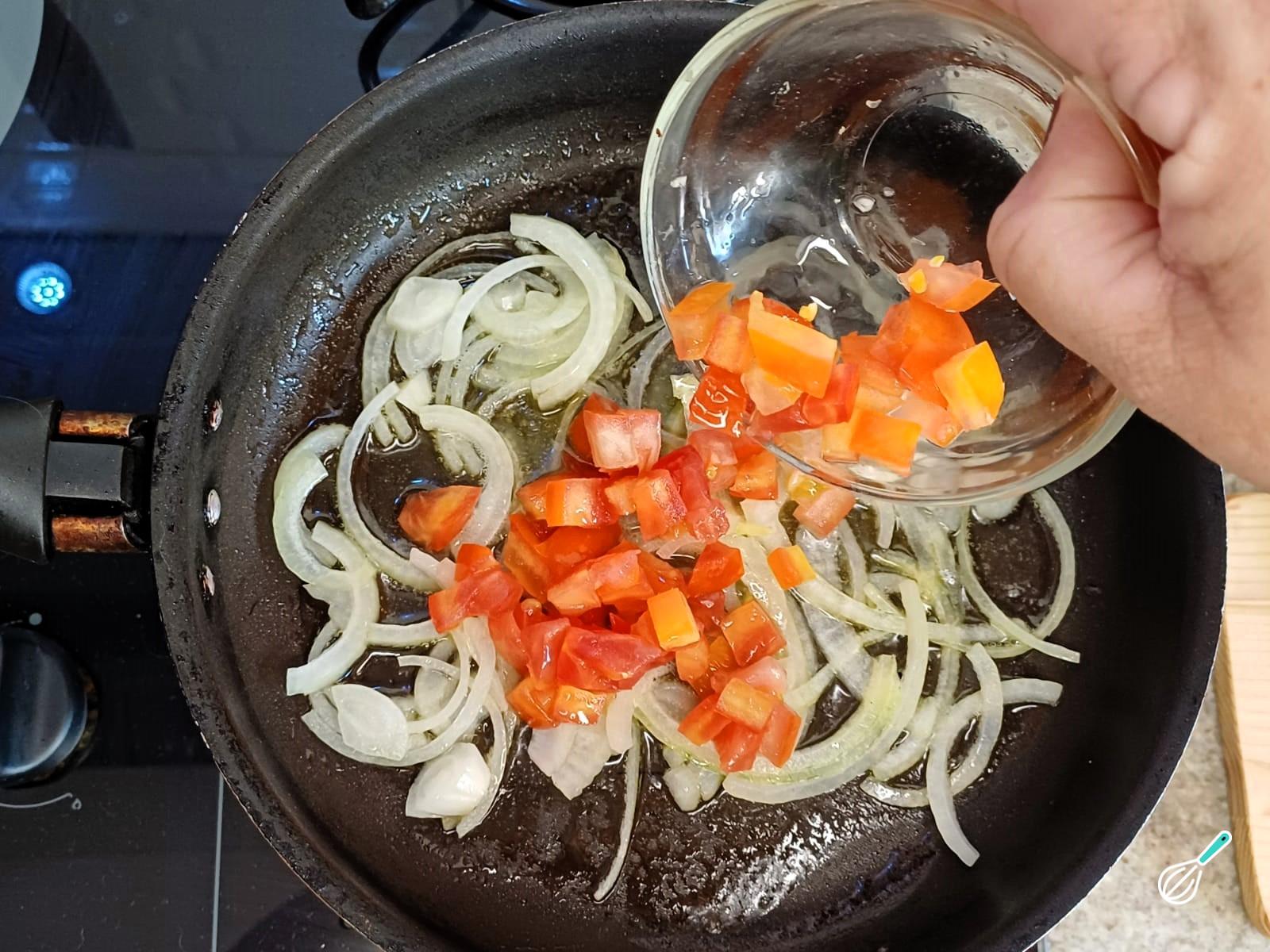 Em uma panela coloque a manteiga, leve ao fogo médio, refogue a cebola e tomates até murchar bem.