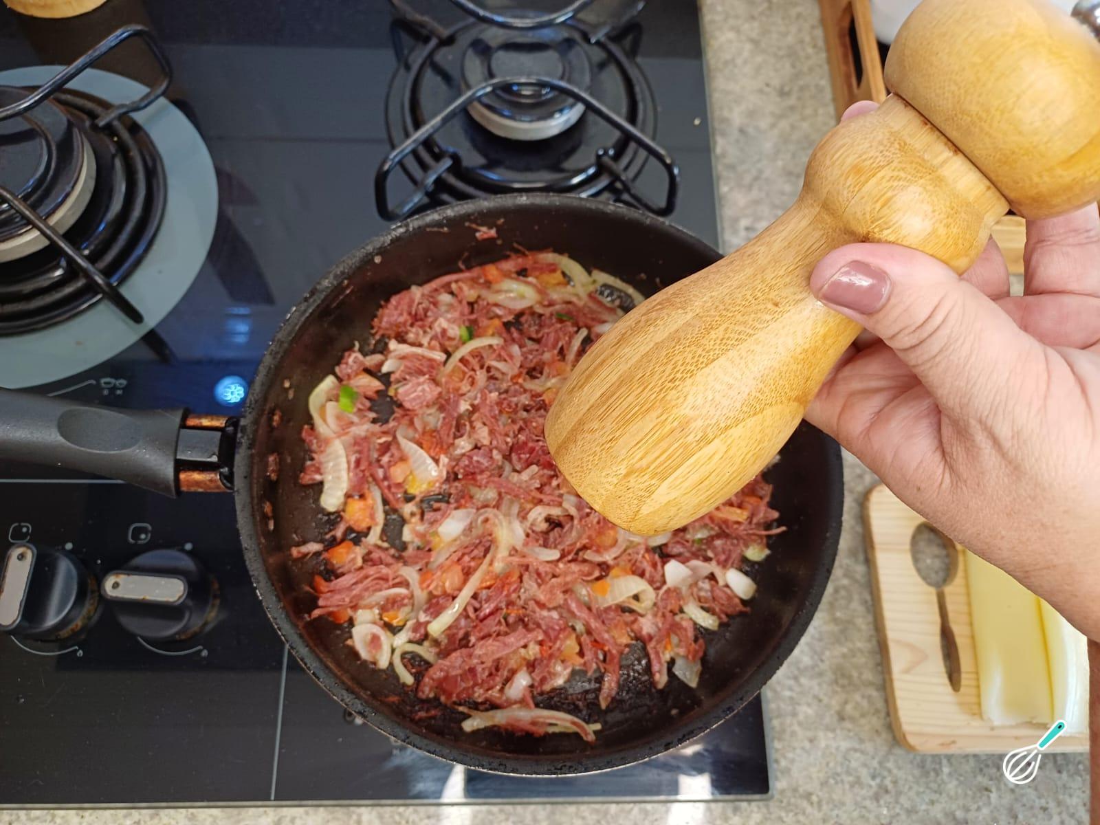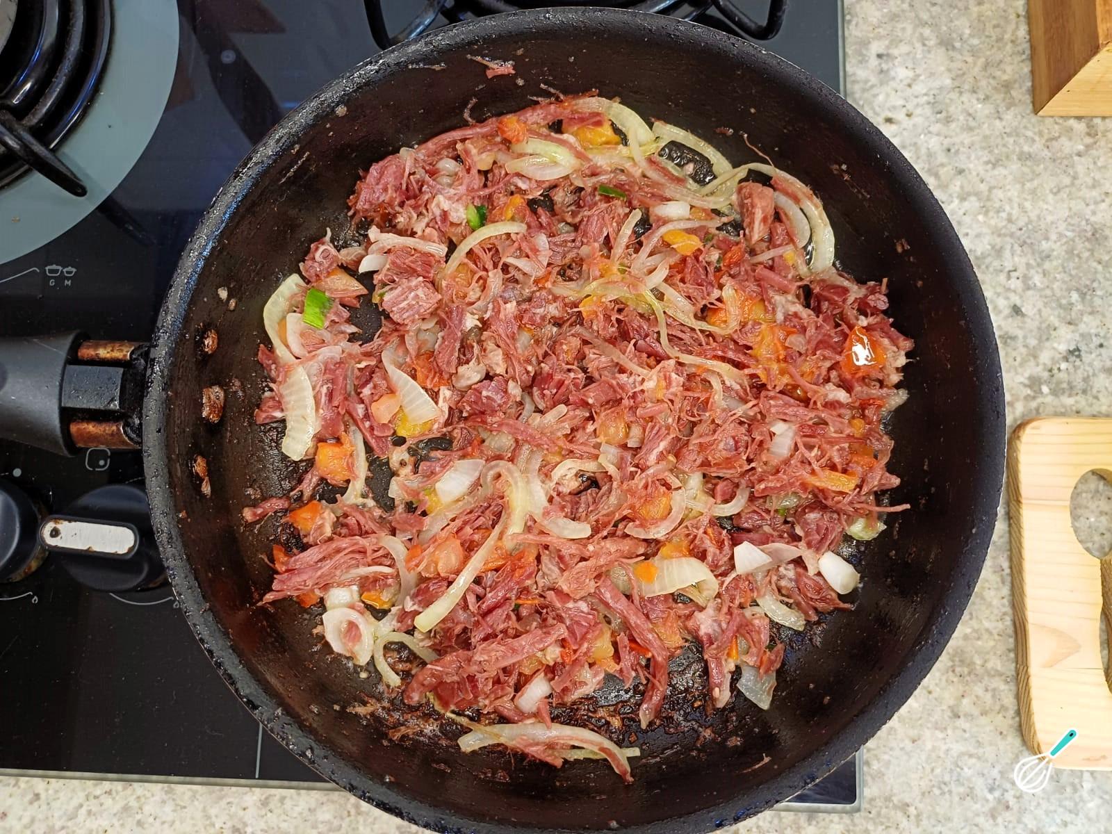 Acrescente a carne seca, cozida e desfiada e deixe refogando em fogo médio por 5 minutos.