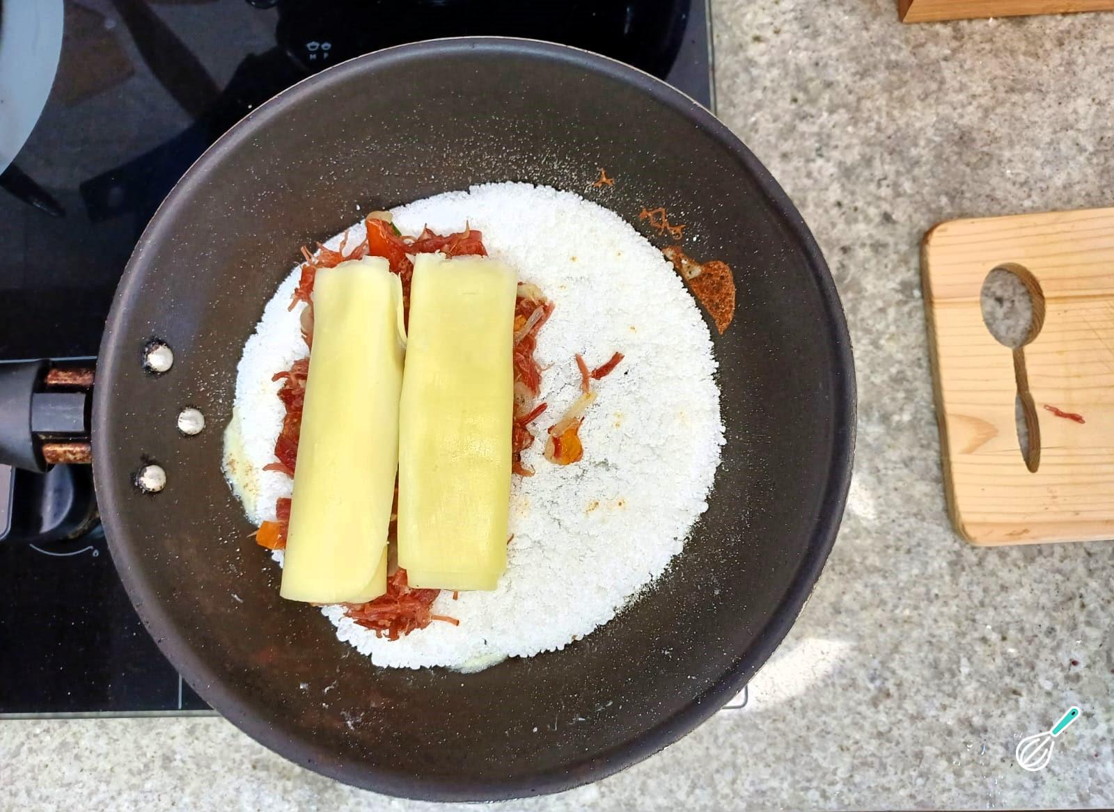 Neste momento espalhe a tapioca cobrindo todo o queijo.