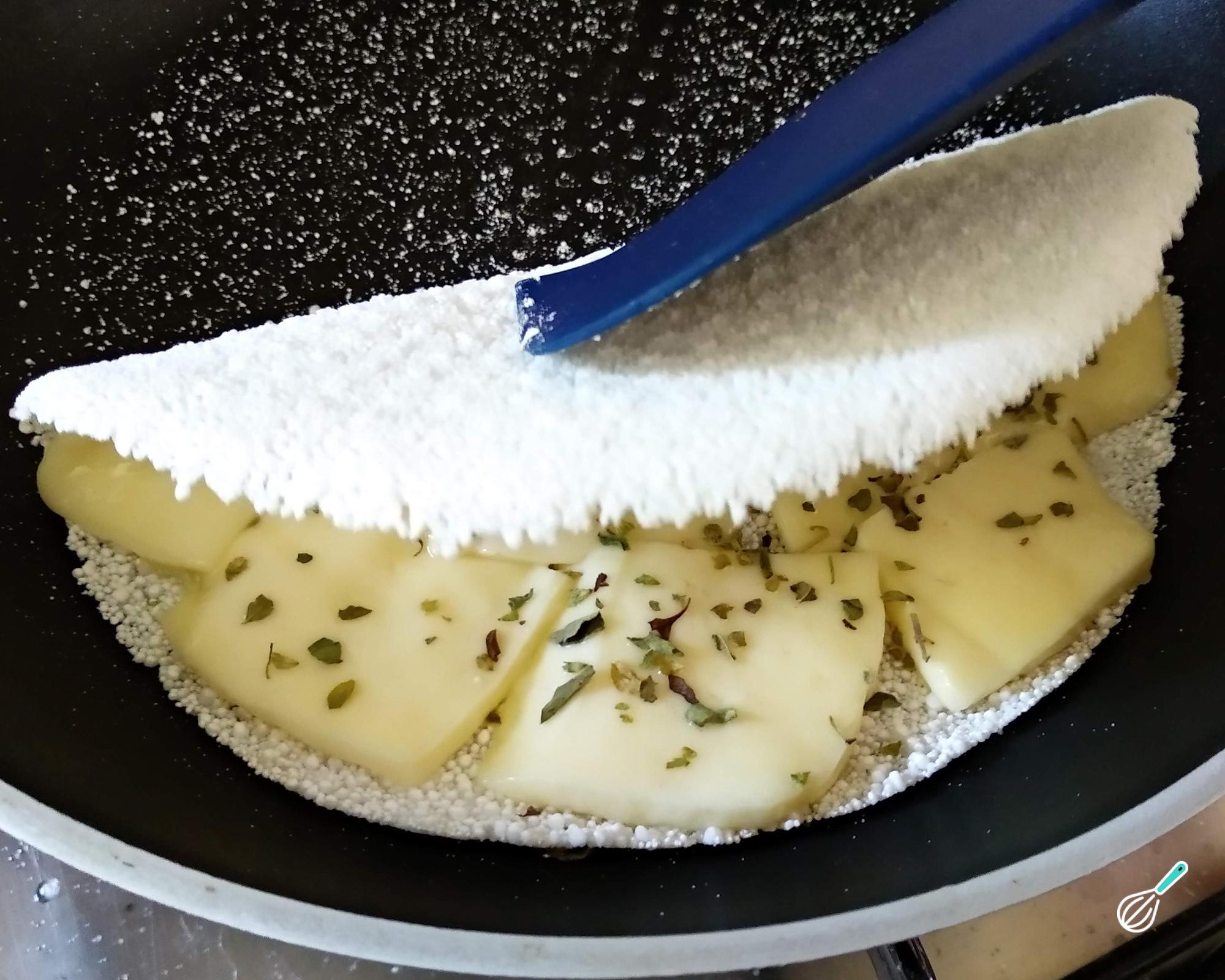 Dica: Você saberá que a tapioca está pronta para dobrar quando ela soltar as beiradas da frigideira. Caso ainda esteja muito mole, deixe cozinhar por mais uns segundinhos.