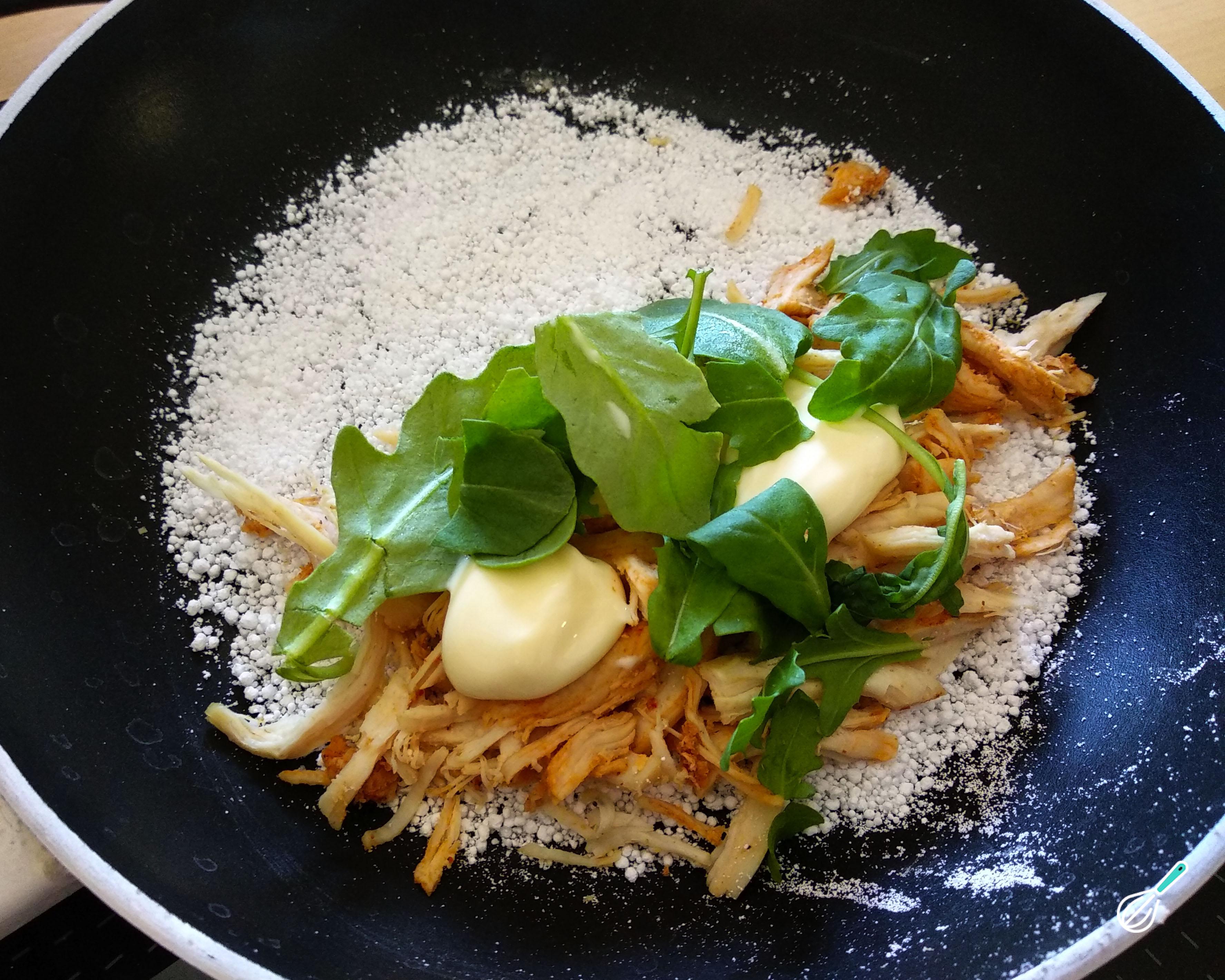 Em seguida coloque o recheio numa das metades da tapioca: um pouco de frango desfiado, catupiry e folhas de rúcula.