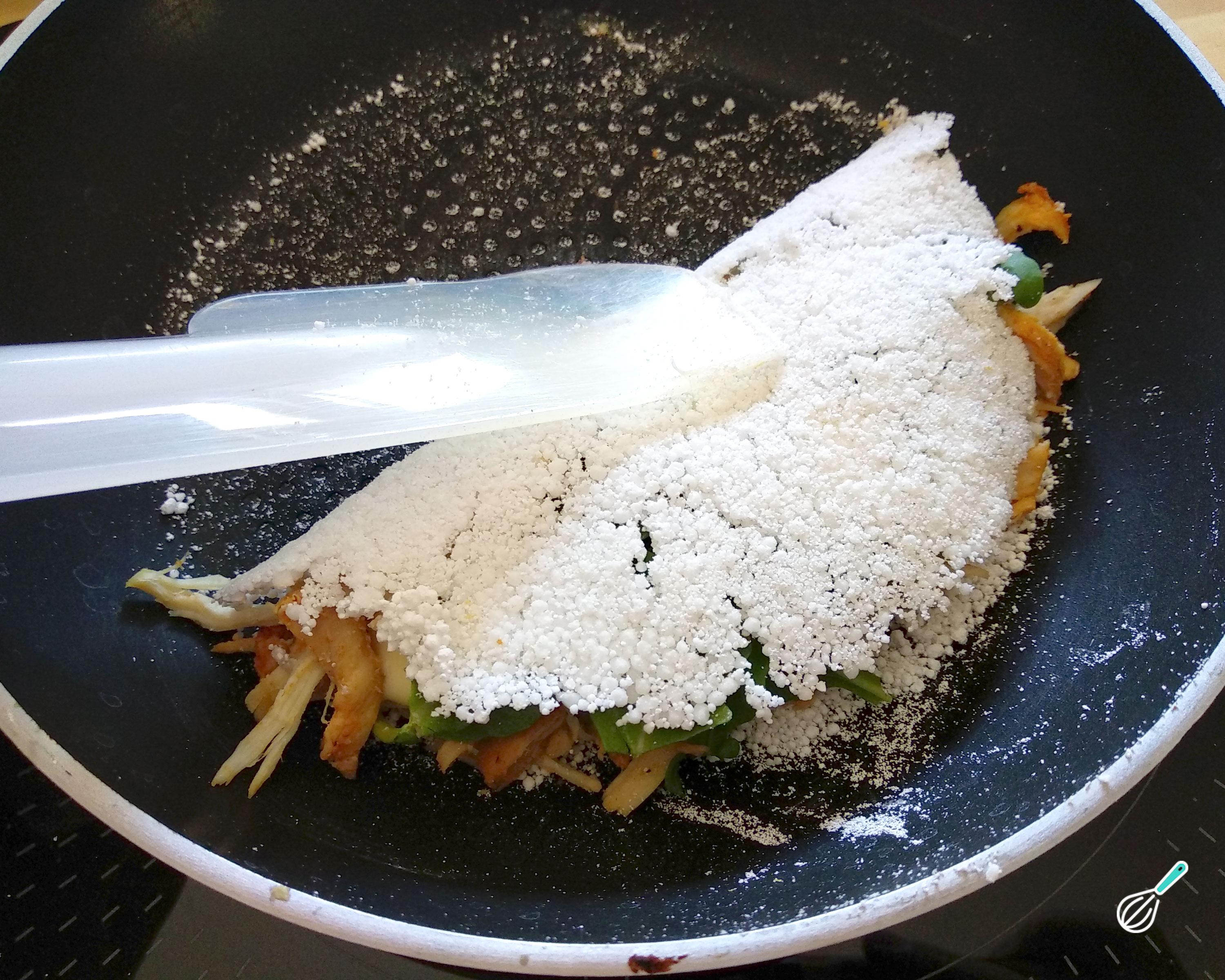 Dobre a tapioca ao meio com a ajuda de uma espátula e deixe na frigideira por mais 1-2 minutos, para o requeijão derreter e se unir com a tapioca e os demais ingredientes do recheio.
