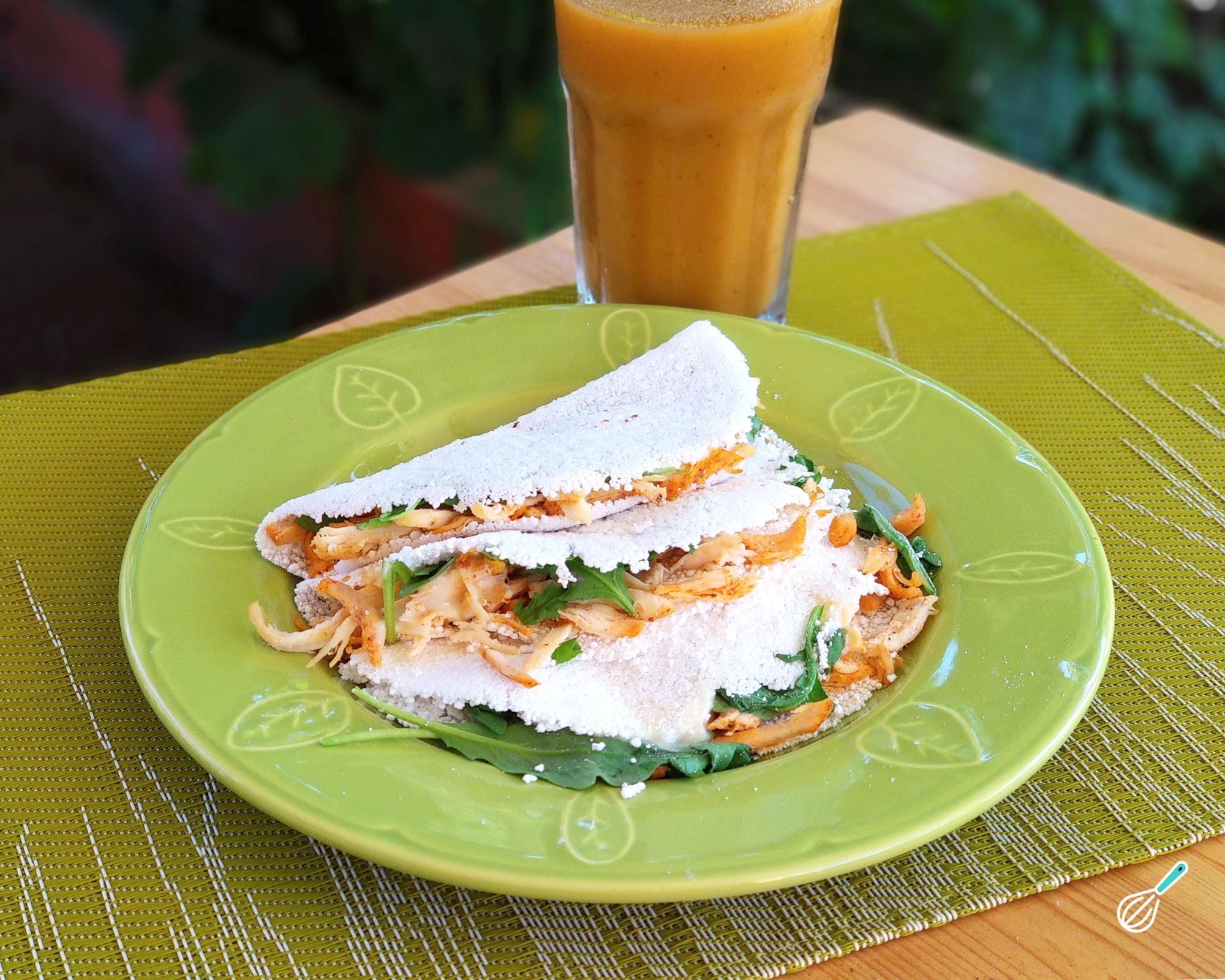 Procurando uma sugestão para um almoço rápido, prático e fit? Tapioca de frigideira é a resposta! Fica prontinha em menos de 5 minutos e sacia sem pesar. As opções de recheio salgado de tapioca são várias, nesse caso usei frango desfiado, requeijão cremoso e rúcula.
