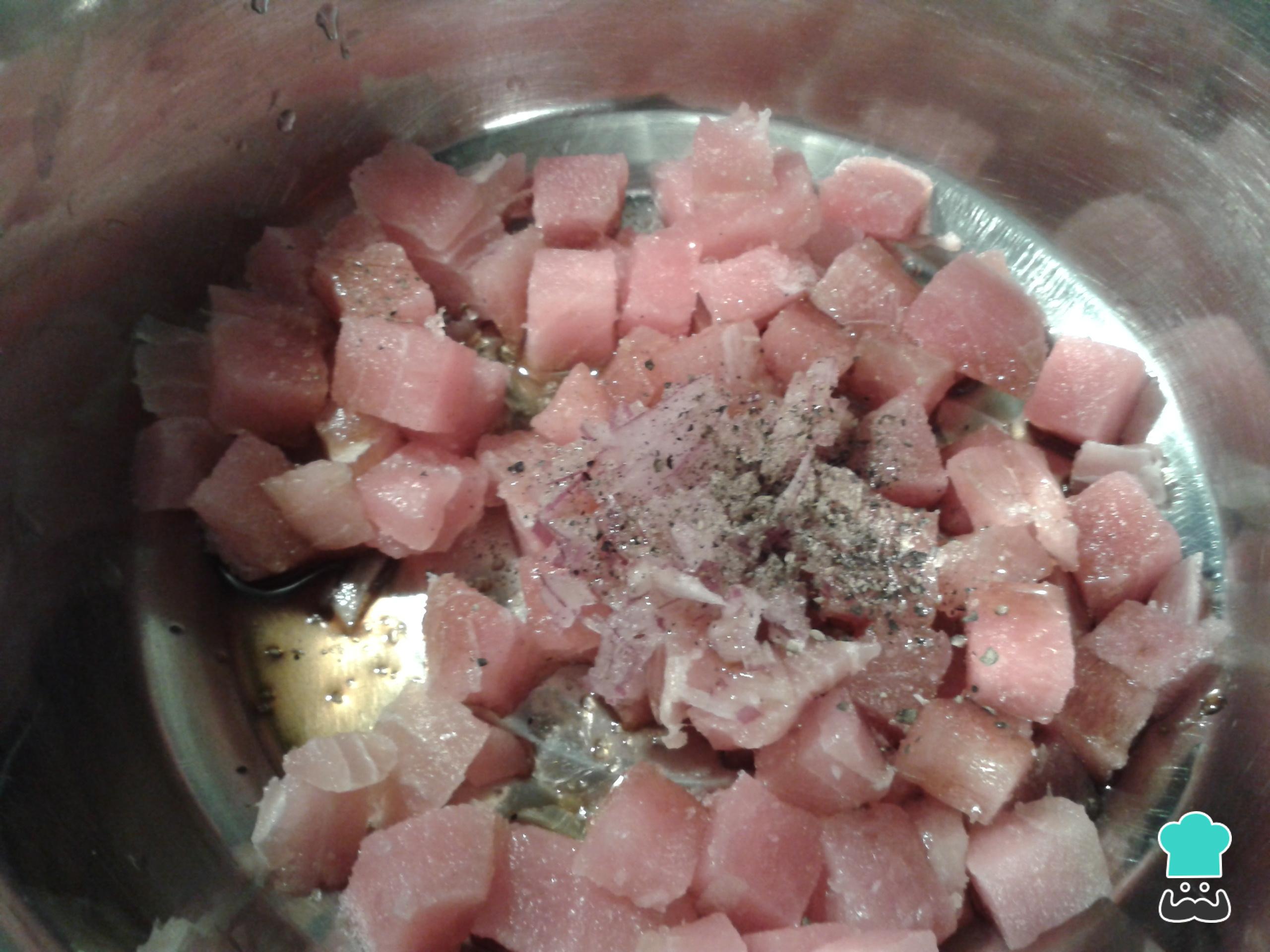 Corte o atum em cubos com cerca de 1 cm e a cebola em pedaços bem pequenos. Misture estes ingredientes com o shoyu e o óleo de sésamo, e tempere a gosto com sal e pimenta. Reserve.