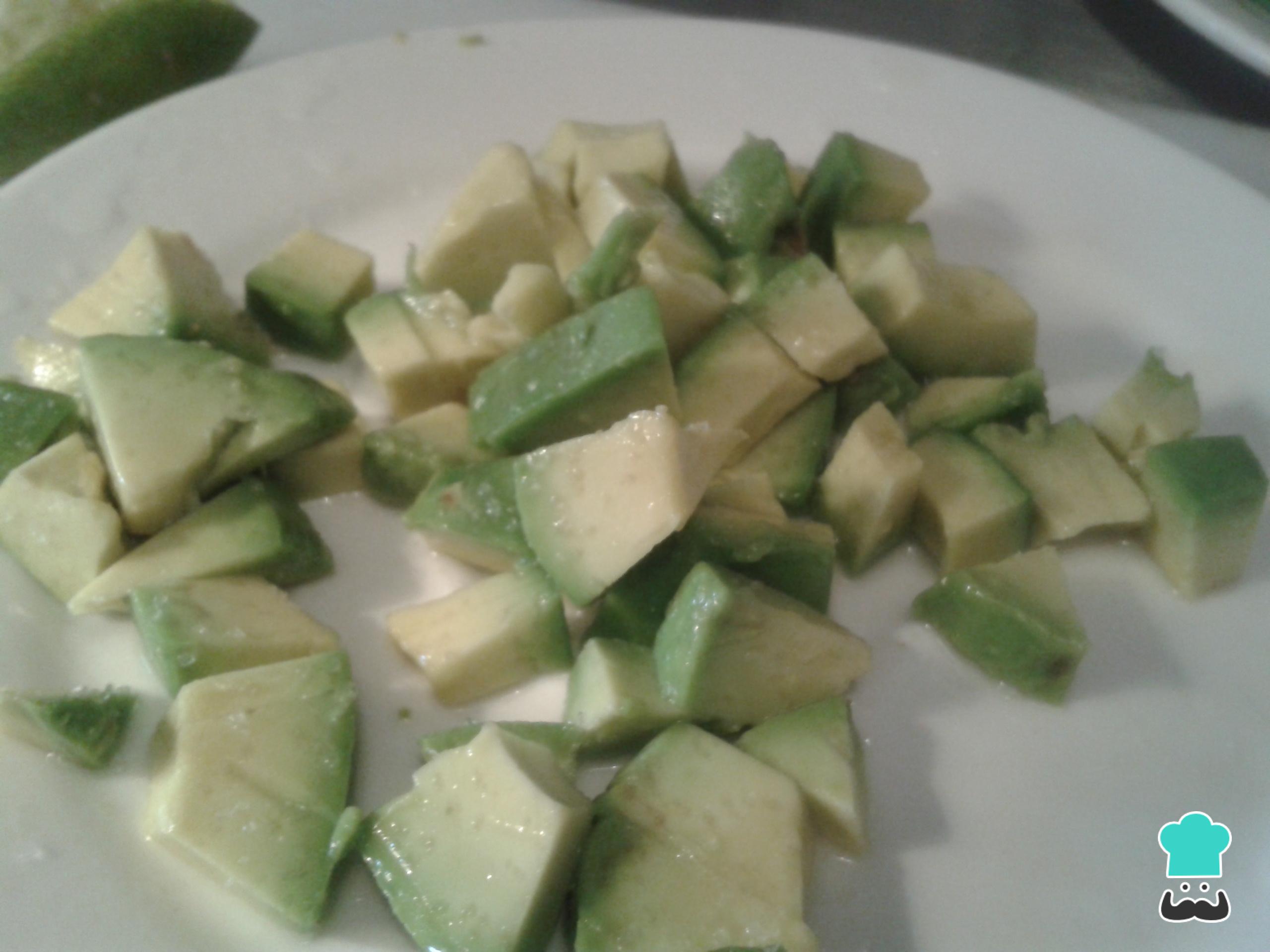 Em seguida descasque o abacate e corte em cubos do mesmo tamanho que o atum. Regue com o suco de limão, para evitar que escureça, e tempere com sal, pimenta e óleo de sésamo.