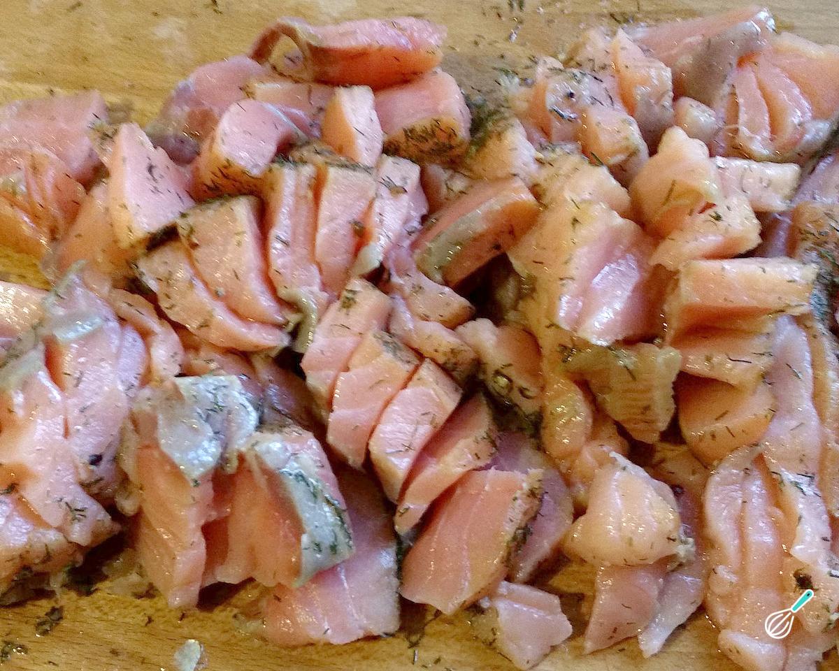 Tempere o salmão com as ervas, sal, pimenta e gotas de limão. Misture e deixe por 5 minutos. Adicione o cream cheese e misture muito bem.