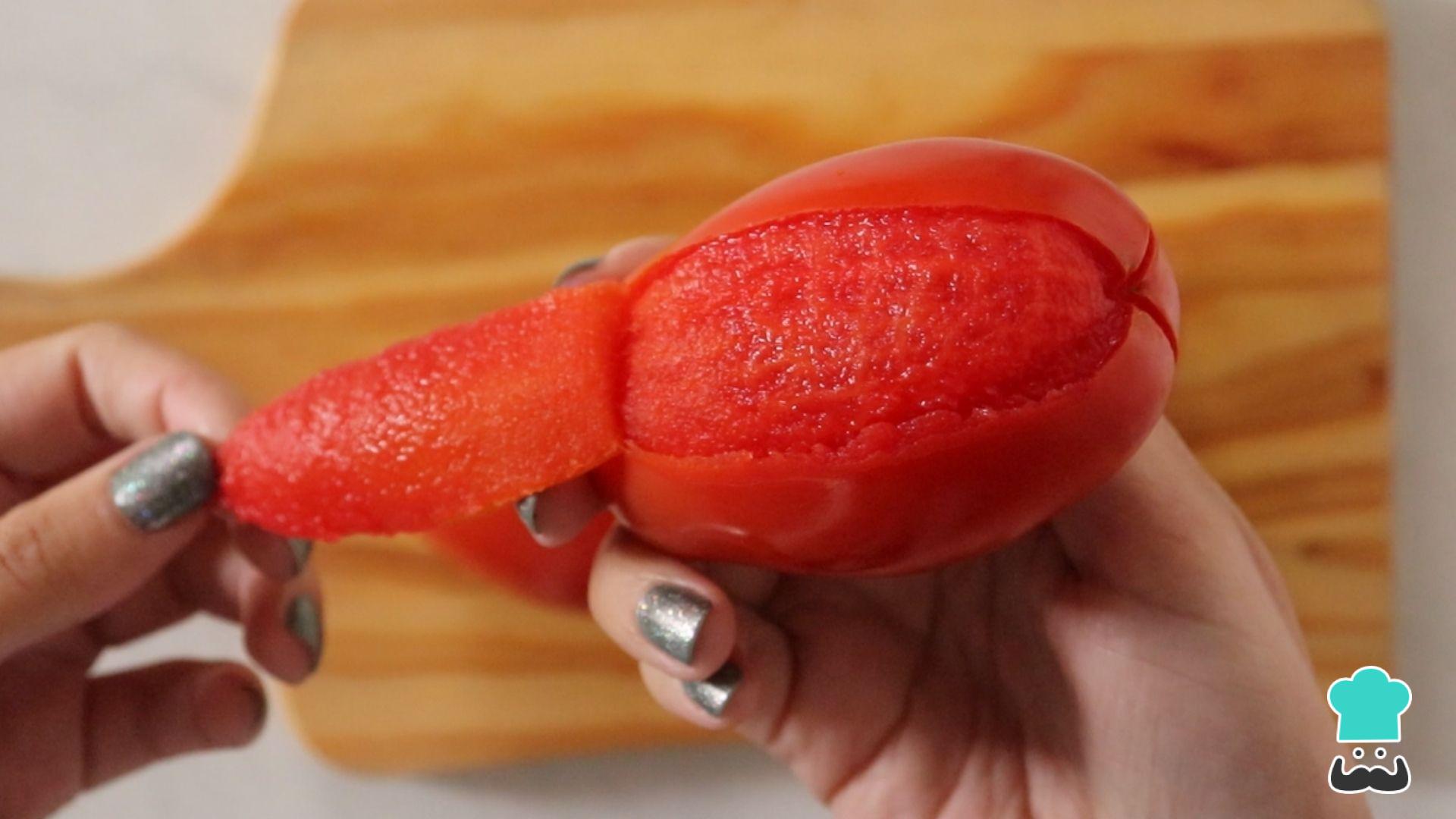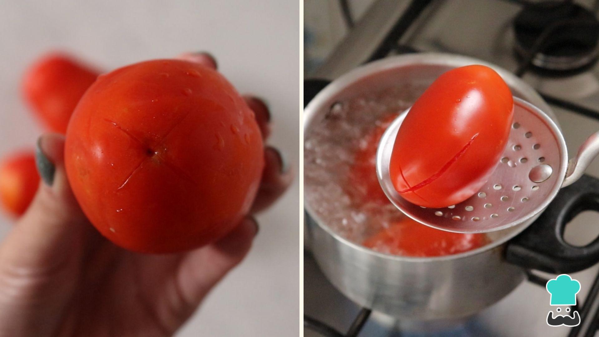 Vamos começar tirando a pele do tomate. Com uma faca, corte um x na base de cada tomate. Leve uma panela grande com água ao fogo alto e assim que ferver mergulhe os tomates aos poucos. Deixe cozinhar até a pele começar a soltar.