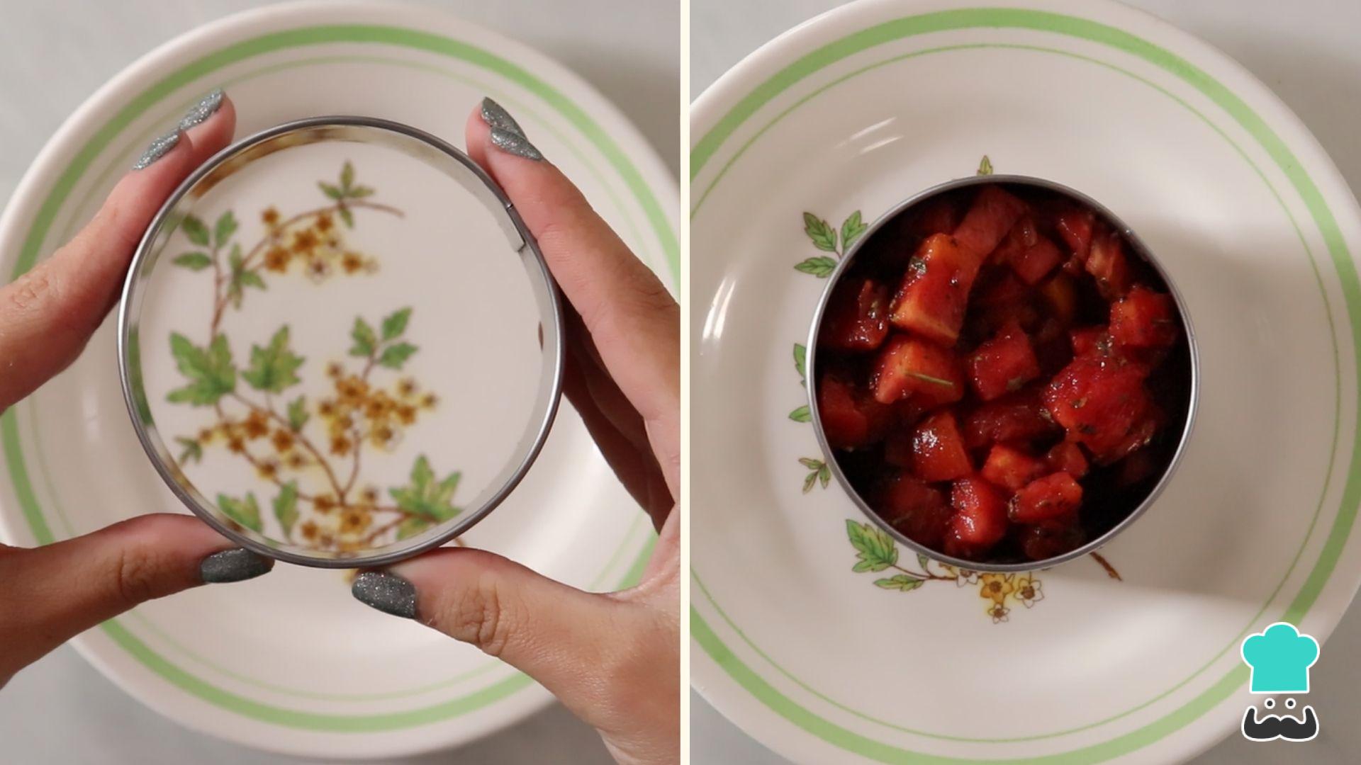 Na hora de servir, para fazer o formato clássico do tartar, use um aro de inox (cortador de biscoito) e coloque o tomate temperado.