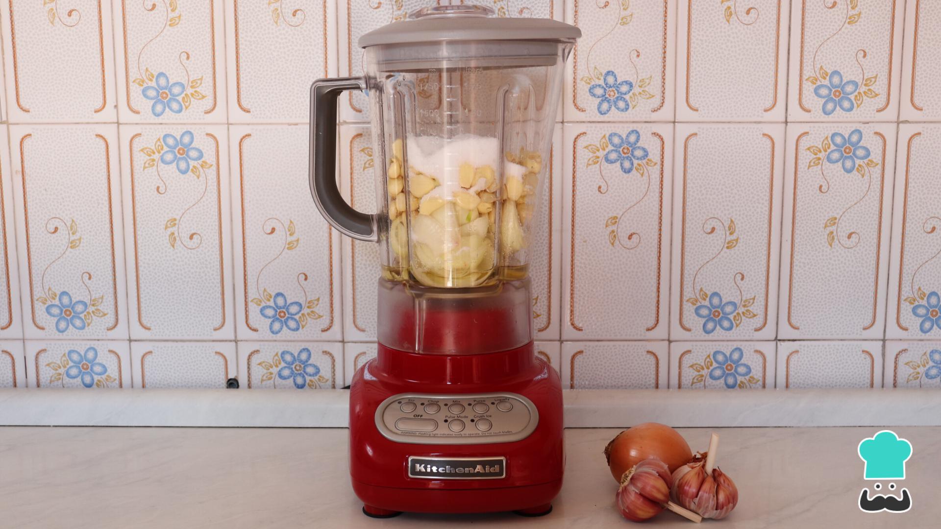 Bata todos os ingredientes no liquidificador até ficar com uma textura cremosa, mas ainda com uns pedacinhos do alho e da cebola. Esse tempero caseiro nada mais é do que isso: o alho batido no liquidificador com sal e óleo - aqui em casa a gente também acrescenta a cebola, a dupla perfeita e básica em todas as nossas refeições.