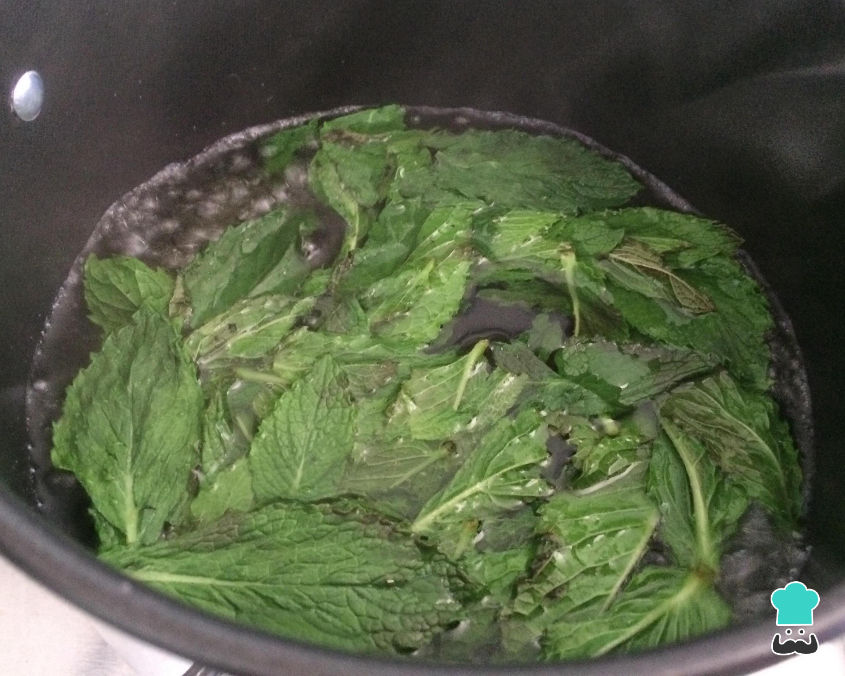 Leve ao fogo médio alto uma panela com água. Quando a água ferver, coloque as folhas de hortelã e deixe fervendo por 1 minuto.