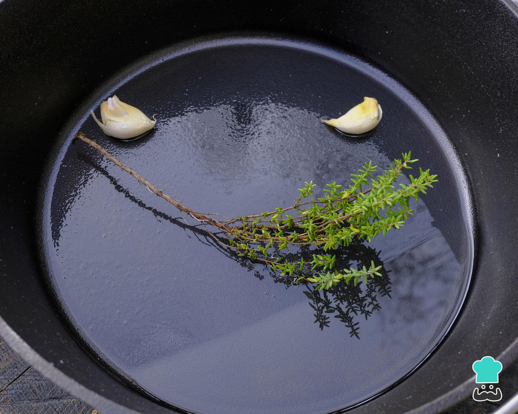 Esmague os alhos com uma faca e coloque numa panela ou frigideira junto com o tomilho e o azeite de oliva. Deixe no fogo baixo por 10-15 minutos, sem deixar ferver. A esse processo de manter os ingredientes no azeite em temperatura baixa se chama 'confitar' e permite que os temperos cozinhem gradualmente e libertem o seu sabor.