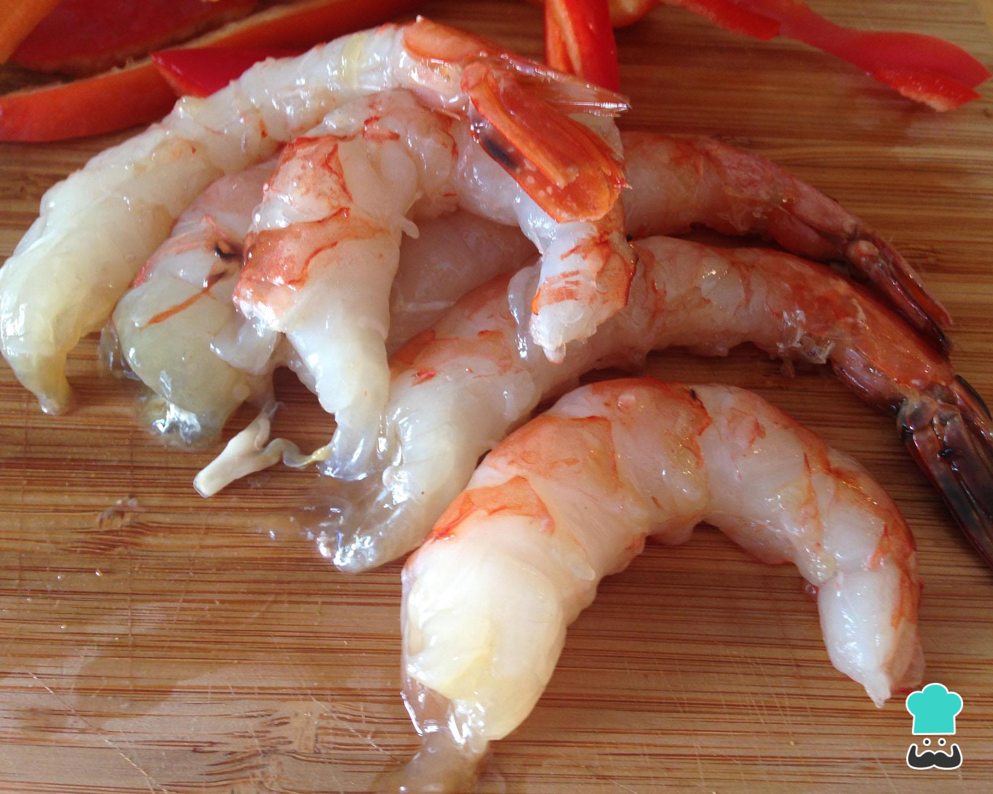 Prepare os camarões: retire a cabeça e a casca, mantendo o rabo para que seja mais fácil pegar neles. Se os camarões forem grandes, com uma faca afiada faça um corte na parte de cima deles e retire a veia. Enxague os camarões e, se quiser, tempere com sal e pimenta.