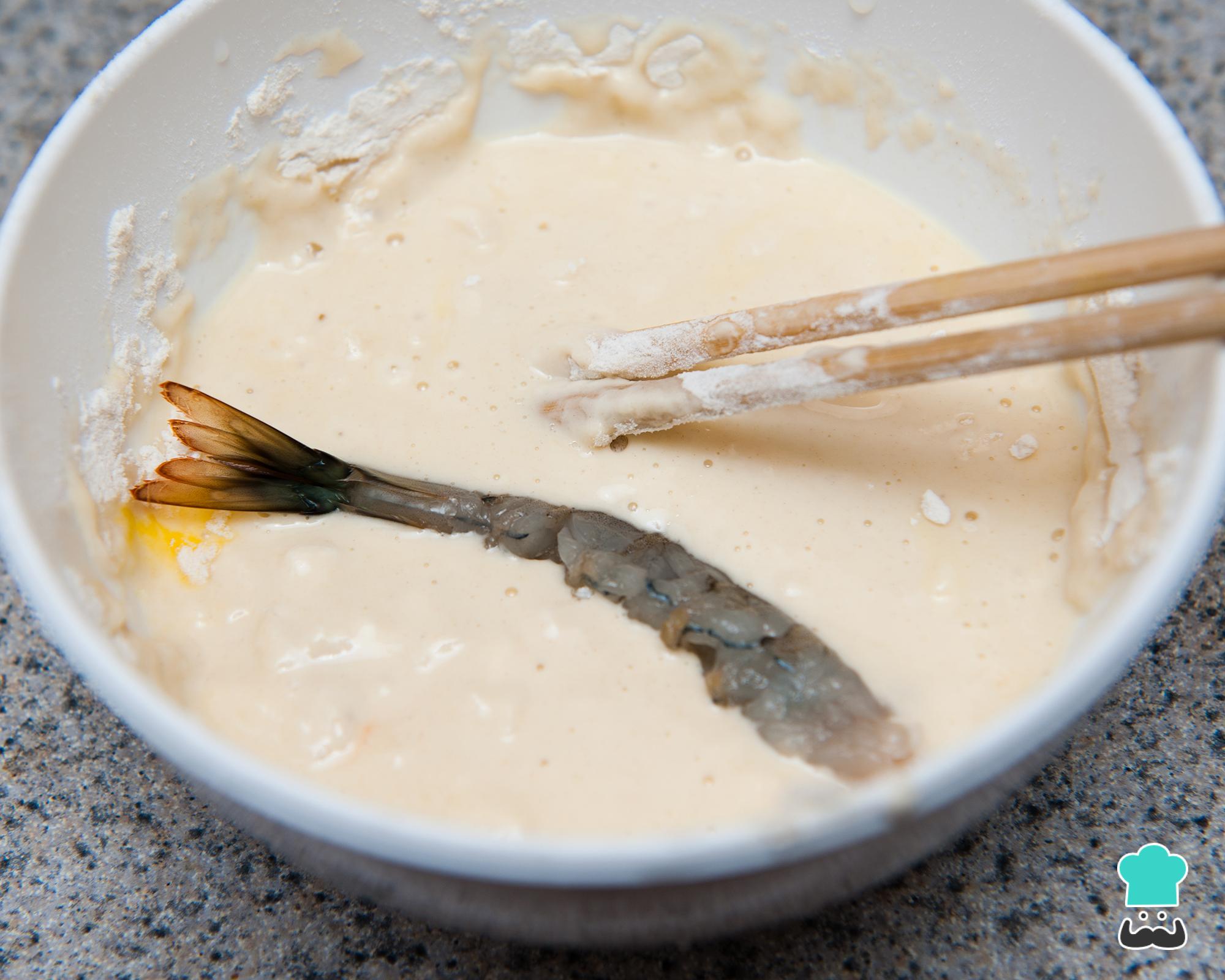 Após o tempo de repouso da massa, continue preparando esta receita de tempura de camarão. Esquente o óleo e, quando estiver quente, mergulhe cada um dos camarões na massa e coloque fritando logo em seguida.