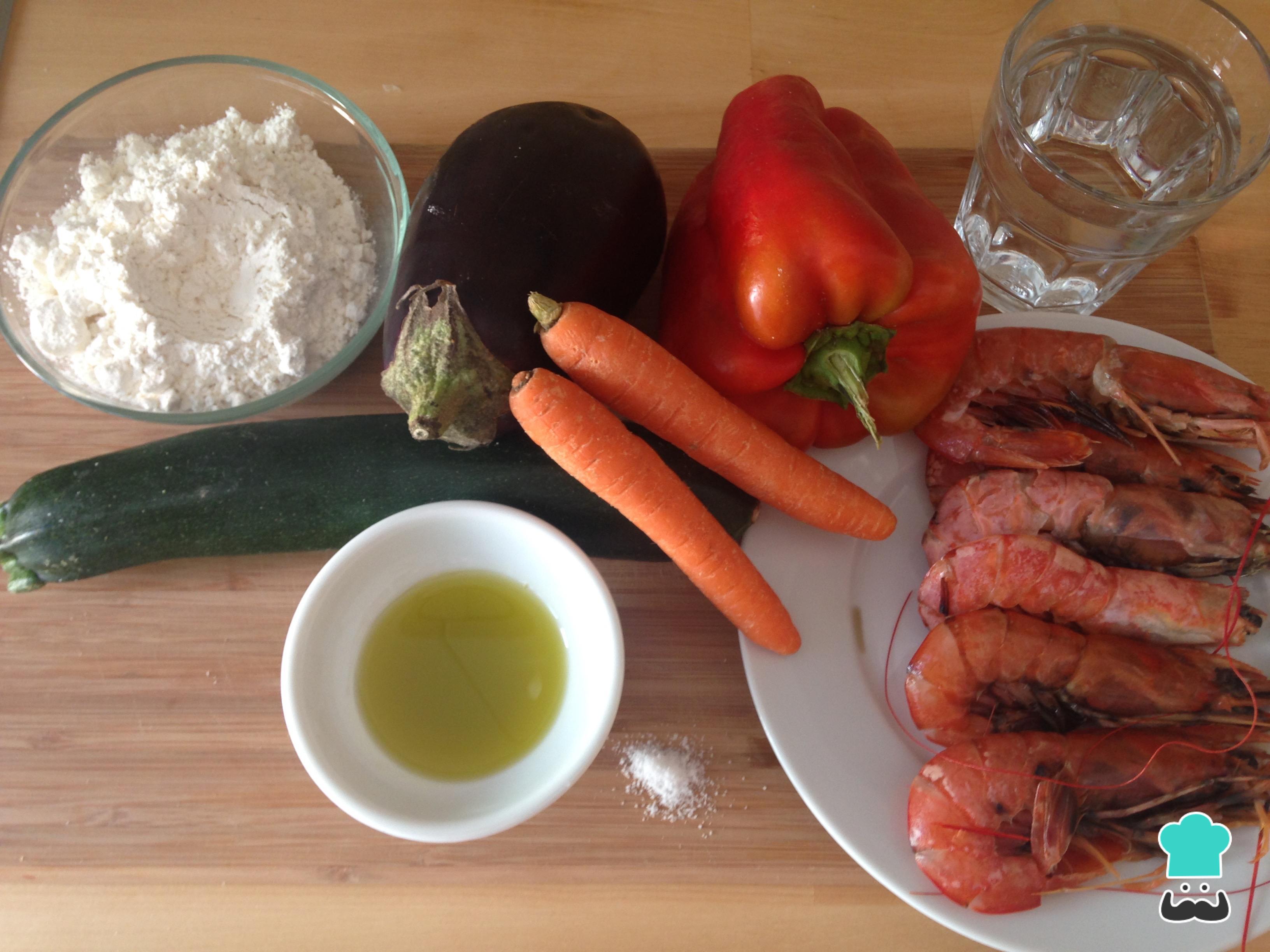 Comece por reunir todos os ingredientes para preparar o tempura de camarão e legumes.
