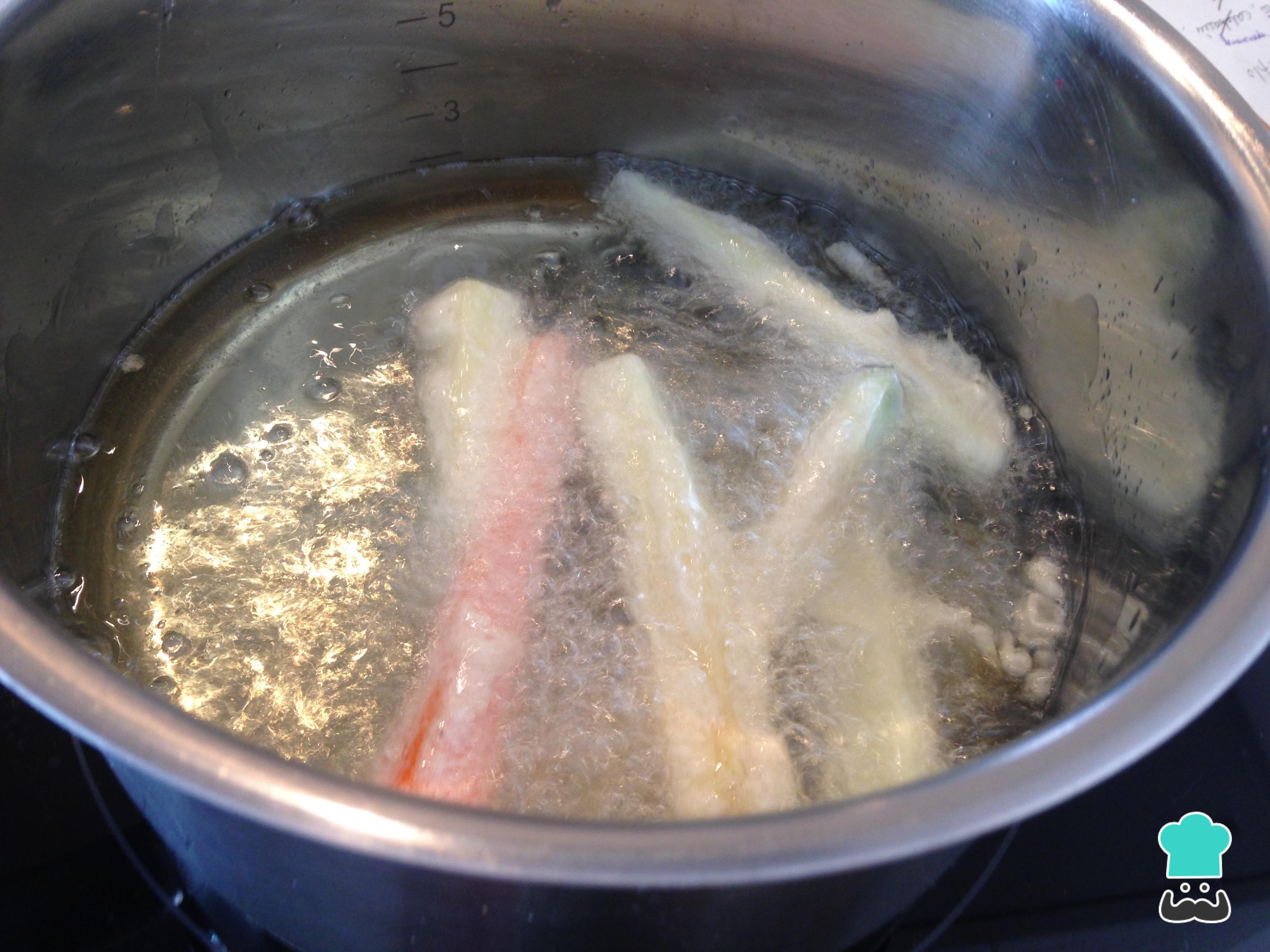 Quando o óleo estiver bem quente, envolva os legumes e os camarões no polme e coloque fritando, até que fiquem dourados.