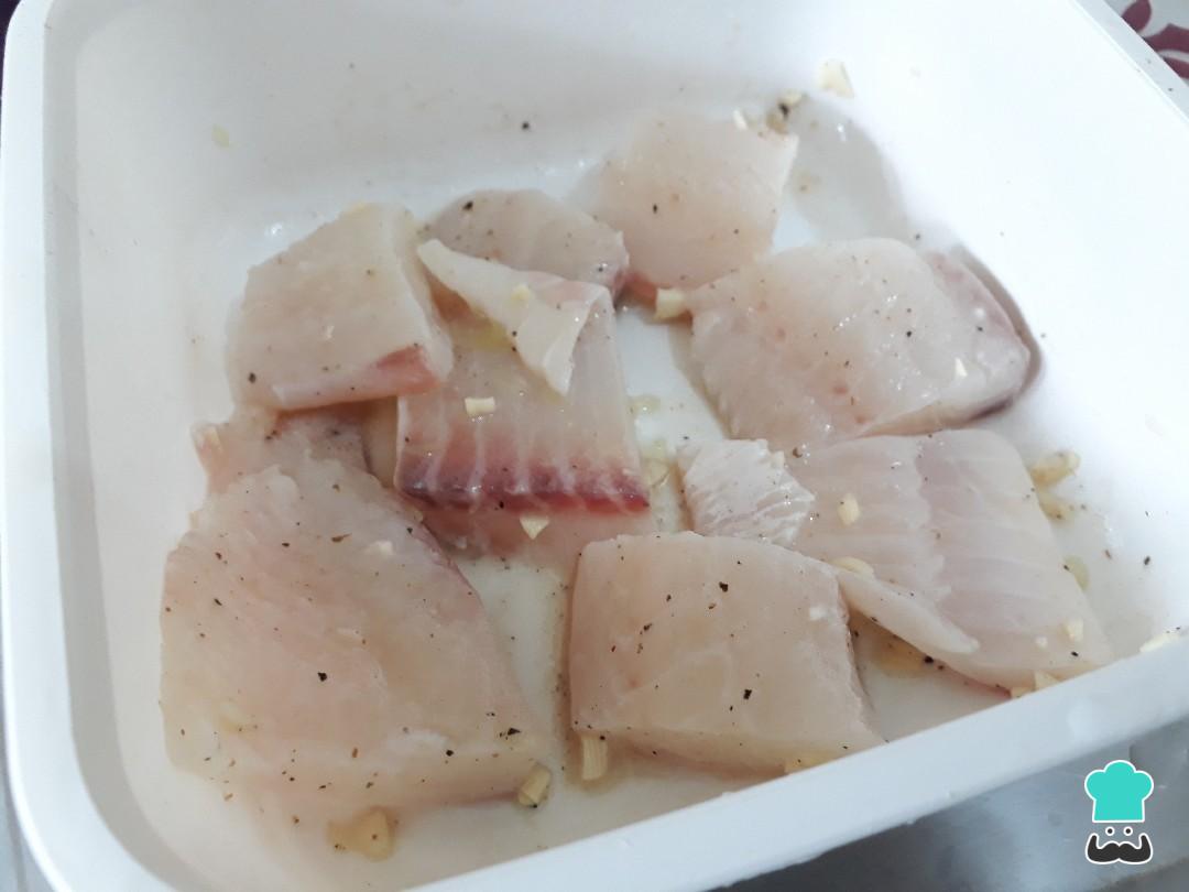 Primeiramente tempere os filés de tilápia com o alho, sal, pimenta do reino e o suco do limão. Deixe marinar por cerca de 15 minutos, para pegar o sabor.