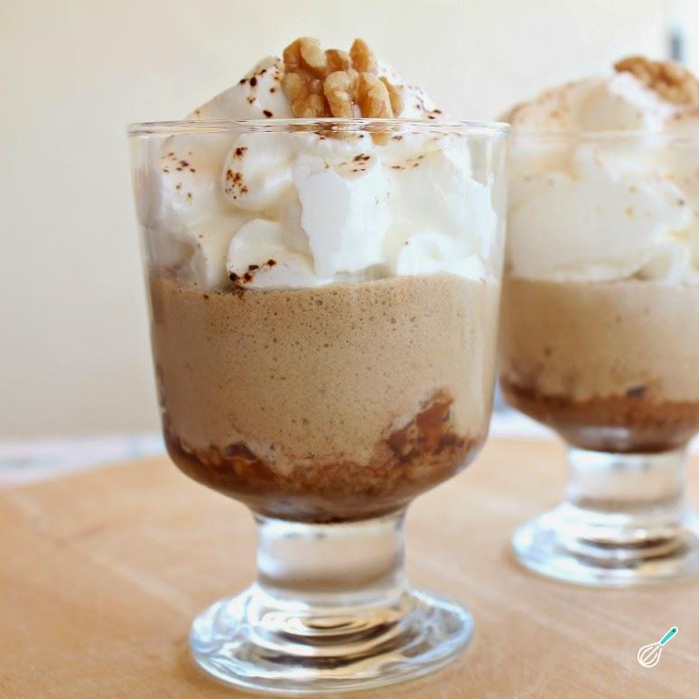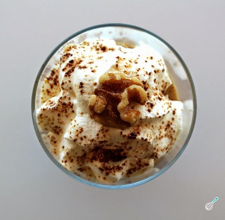No momento de servir o tiramisù de cappuccino, decore com creme chantilly, polvilhe um pouco de café solúvel e complete com a metade de noz. Delicioso!