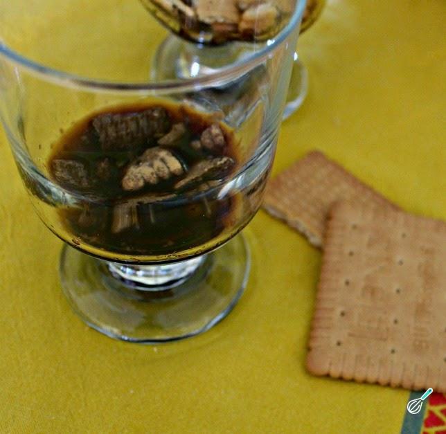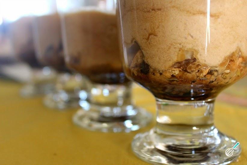 Após o passo anterior, comece montando o tiramisù em copinhos ou tigelinhas individuais: no fundo coloque um pouco do licor de café, e adicione um pouco dos biscoitos partidos em pedaços.