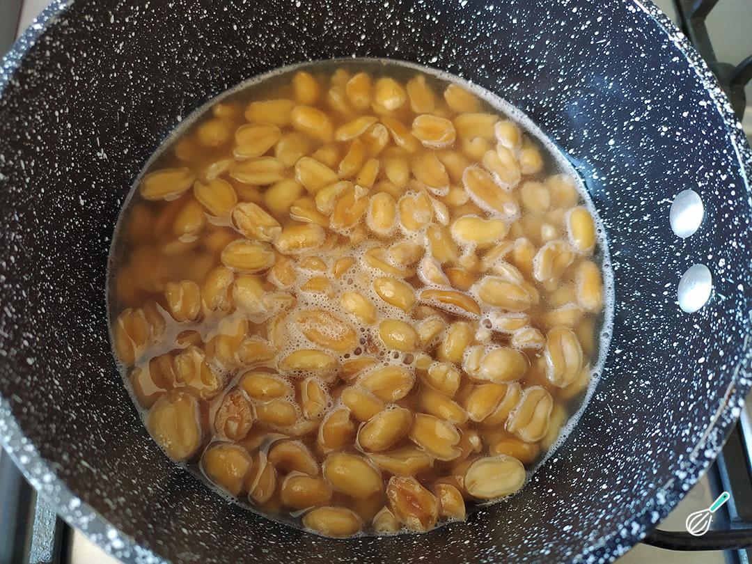 Comece por ferver os amendoins numa panela com água (quantidade suficiente para cobrir os amendoins) por 20 minutos ou até ficarem macios.