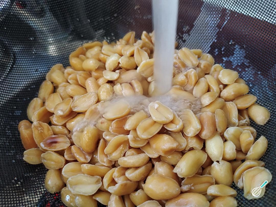 Depois desse tempo enxague os amendoins com água corrente e usando uma peneira, para facilitar.
